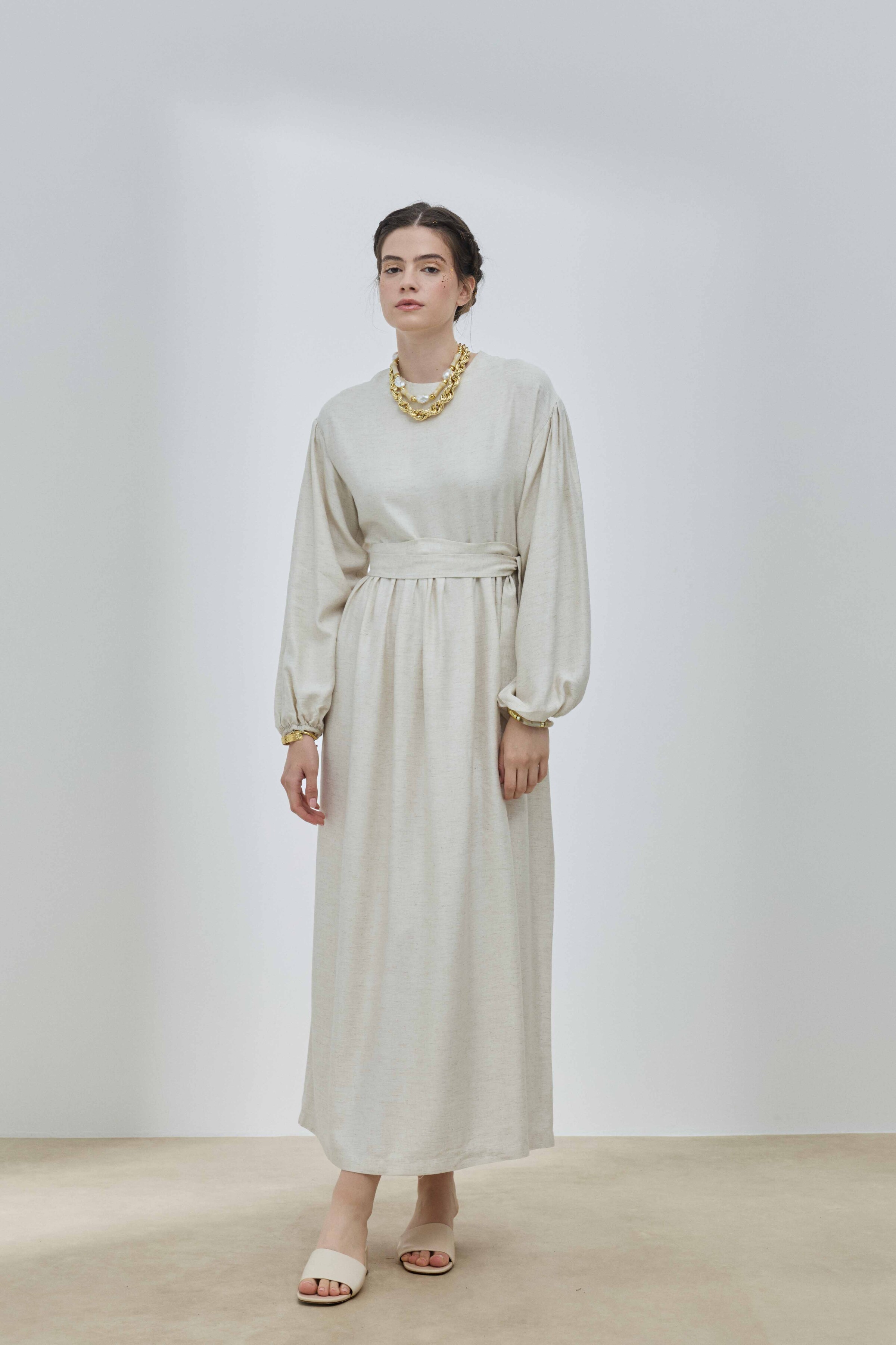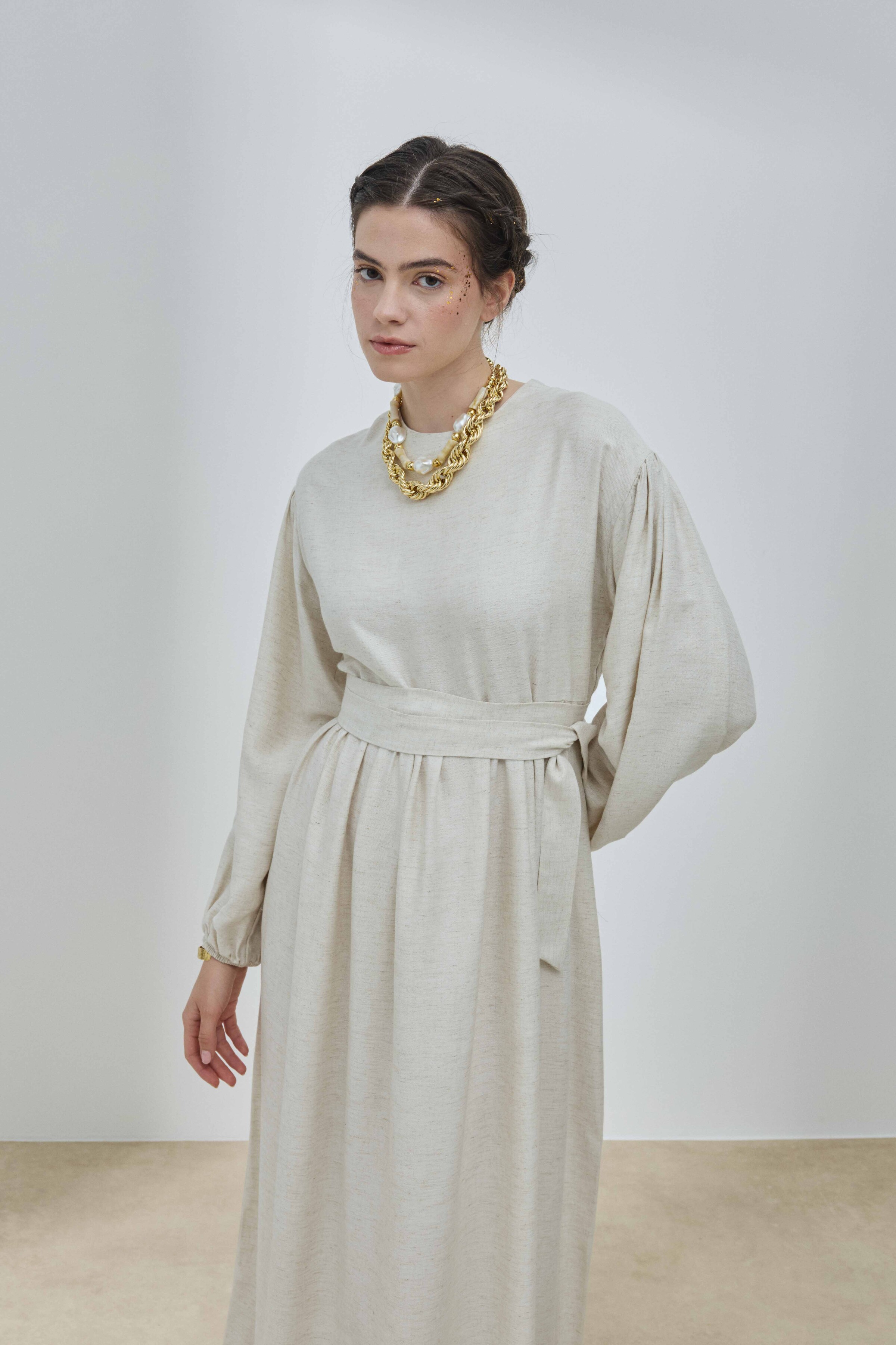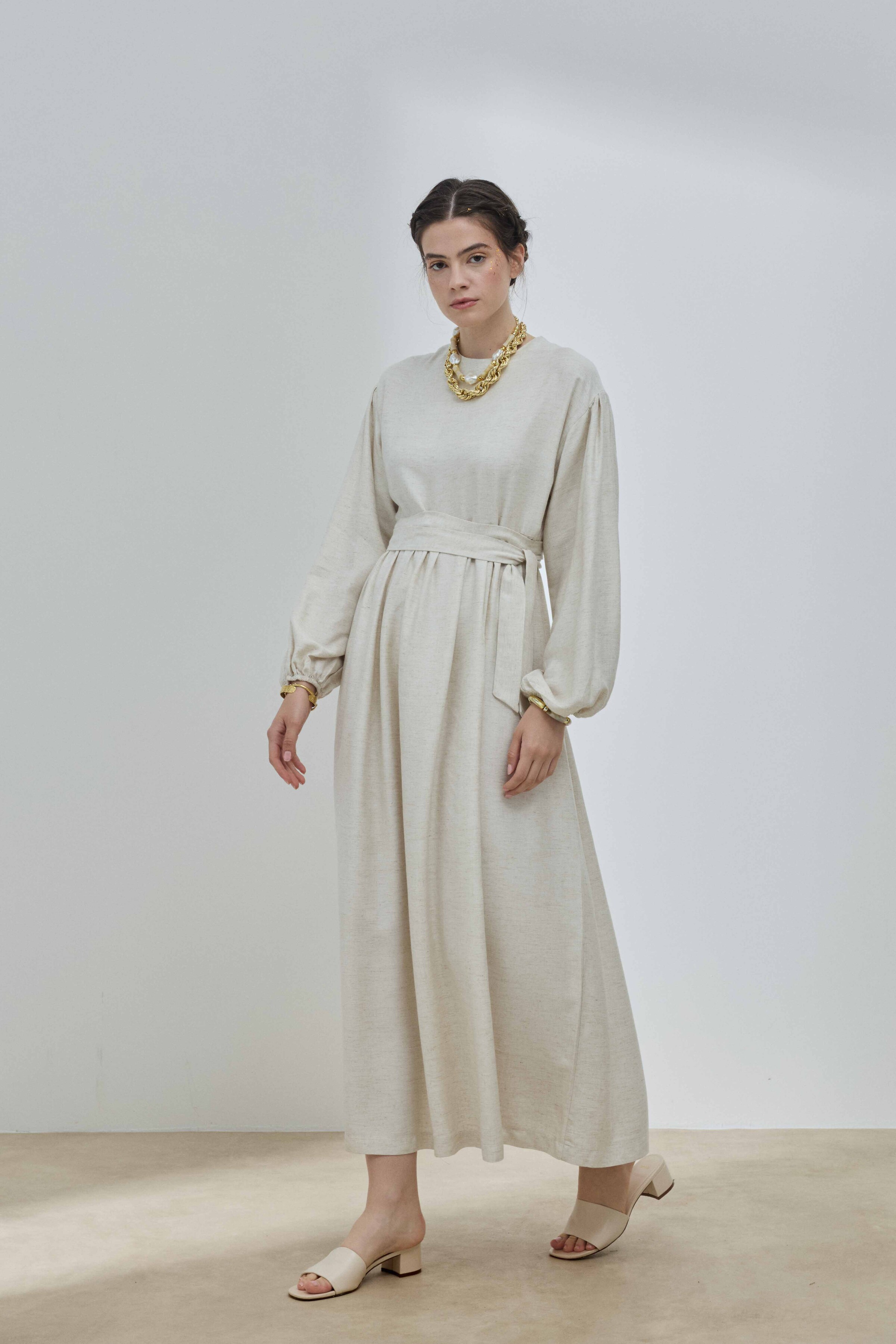 Balon kol modeli ve geniş dökümlü eteği ile ister şık istersen günlük giyiminde sana eşlik edecek Bej Balon Kol Keten Elbise seninle! Özel dokuma keten ve viskon karışımlı kumaşın dokusu bütün Yaz doğallığı ile seni rahat hissettirecek.