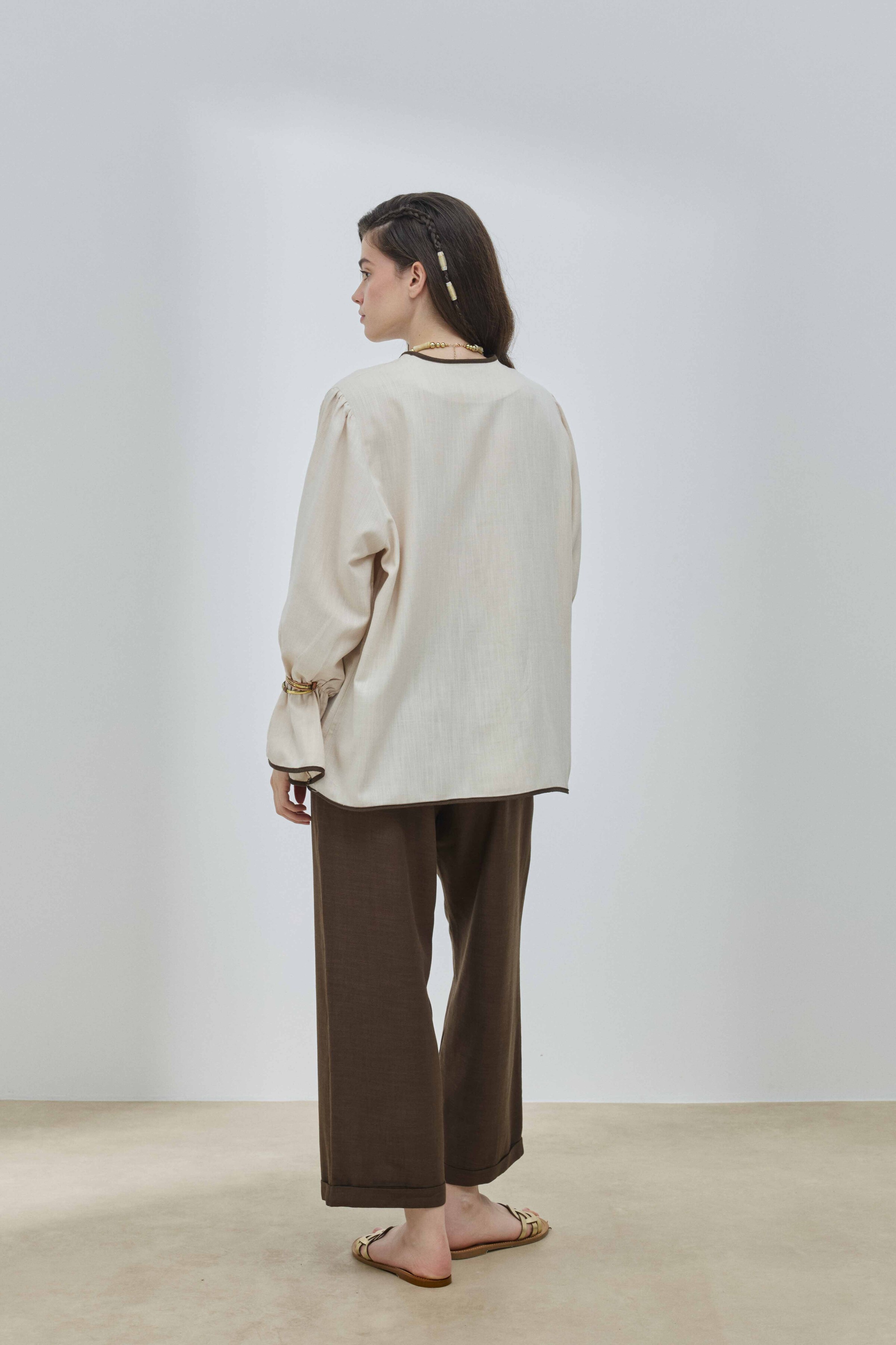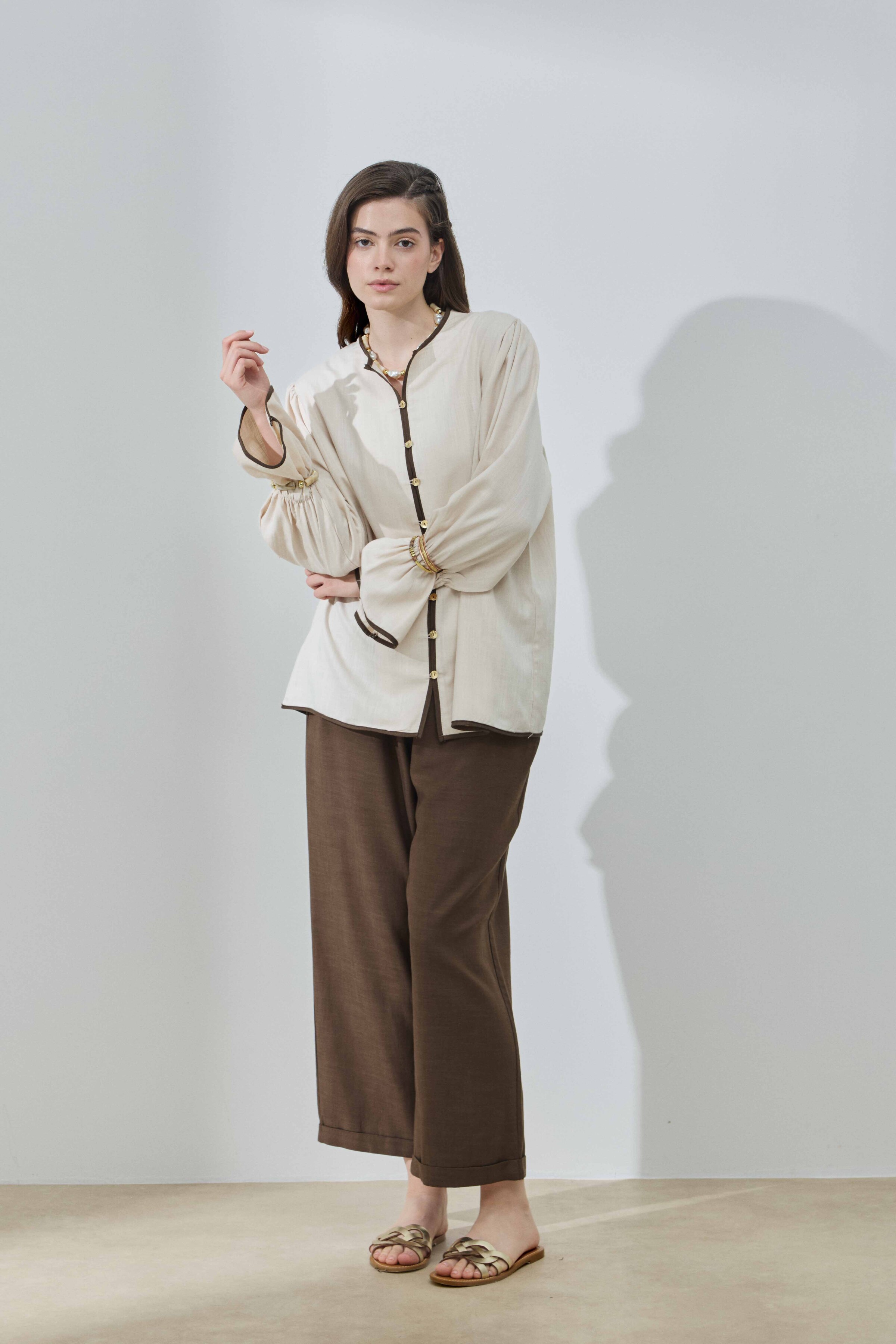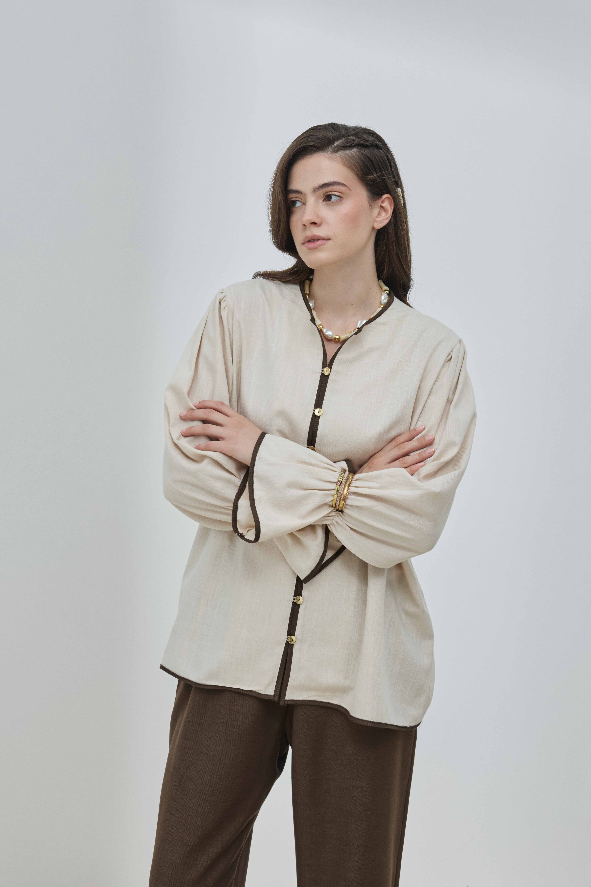 Kontrast renklerin uyumu ile görünümünü öne çıkarabileceğin biyeli gömleği ister şık ister spor kombinleyebilir bu yazın kurtarıcı parçası olarak kullanabilirsin. Ethereal Roots koleksiyonunun minimal ve zamansız çizgilerini taşıyan doğal kumaş kontrast biyeli gömlek uzun yıllar seninle!