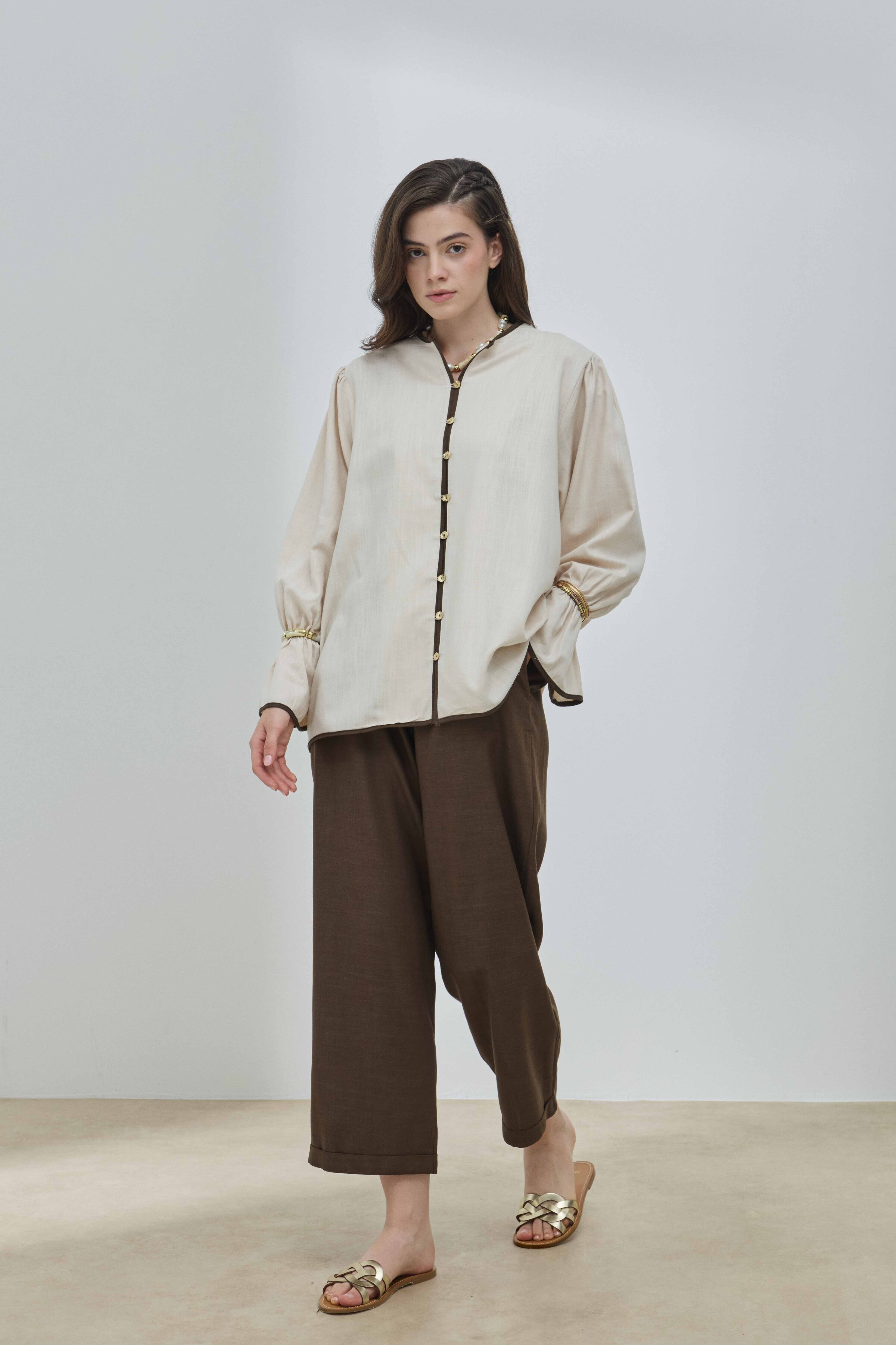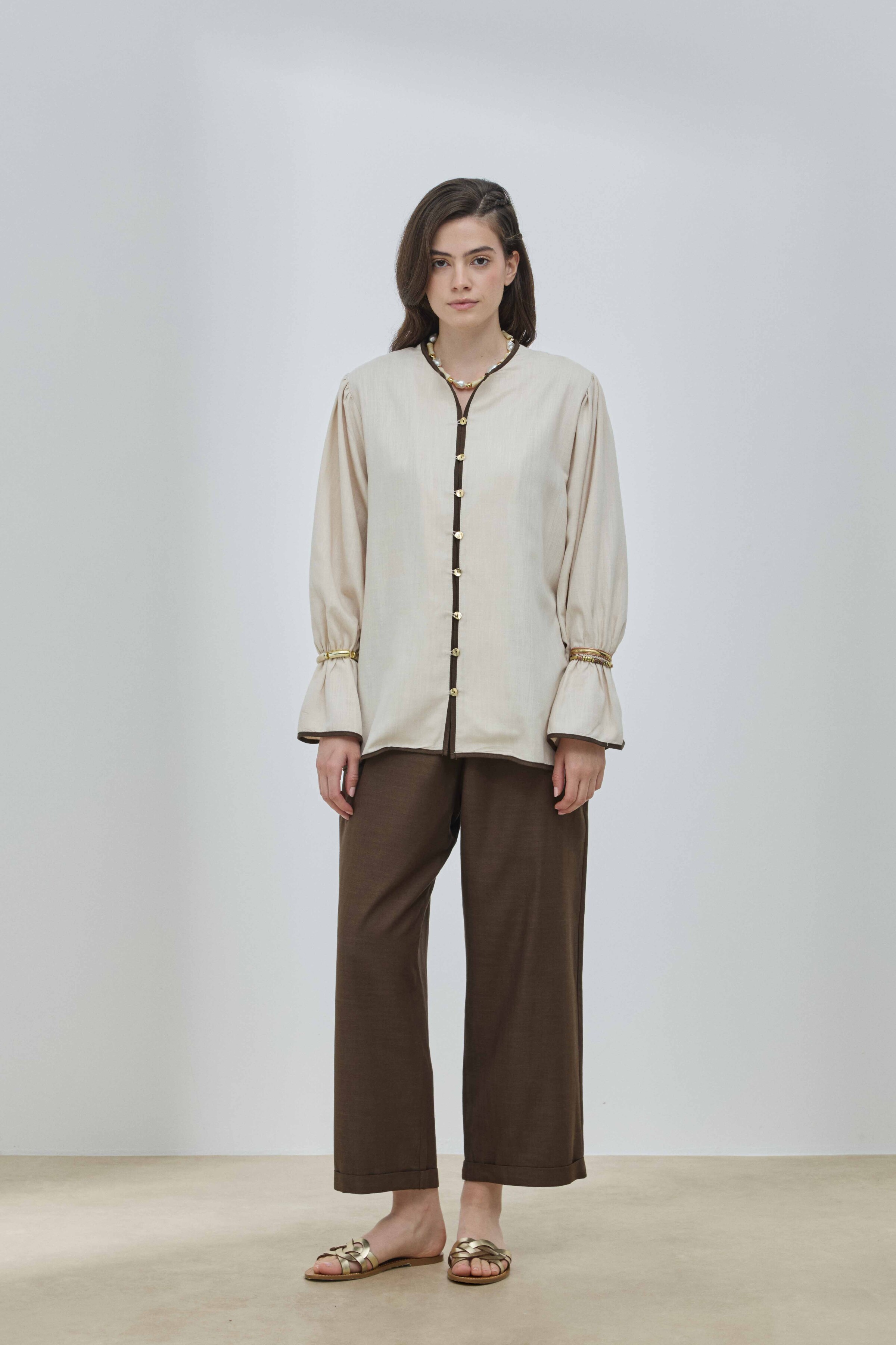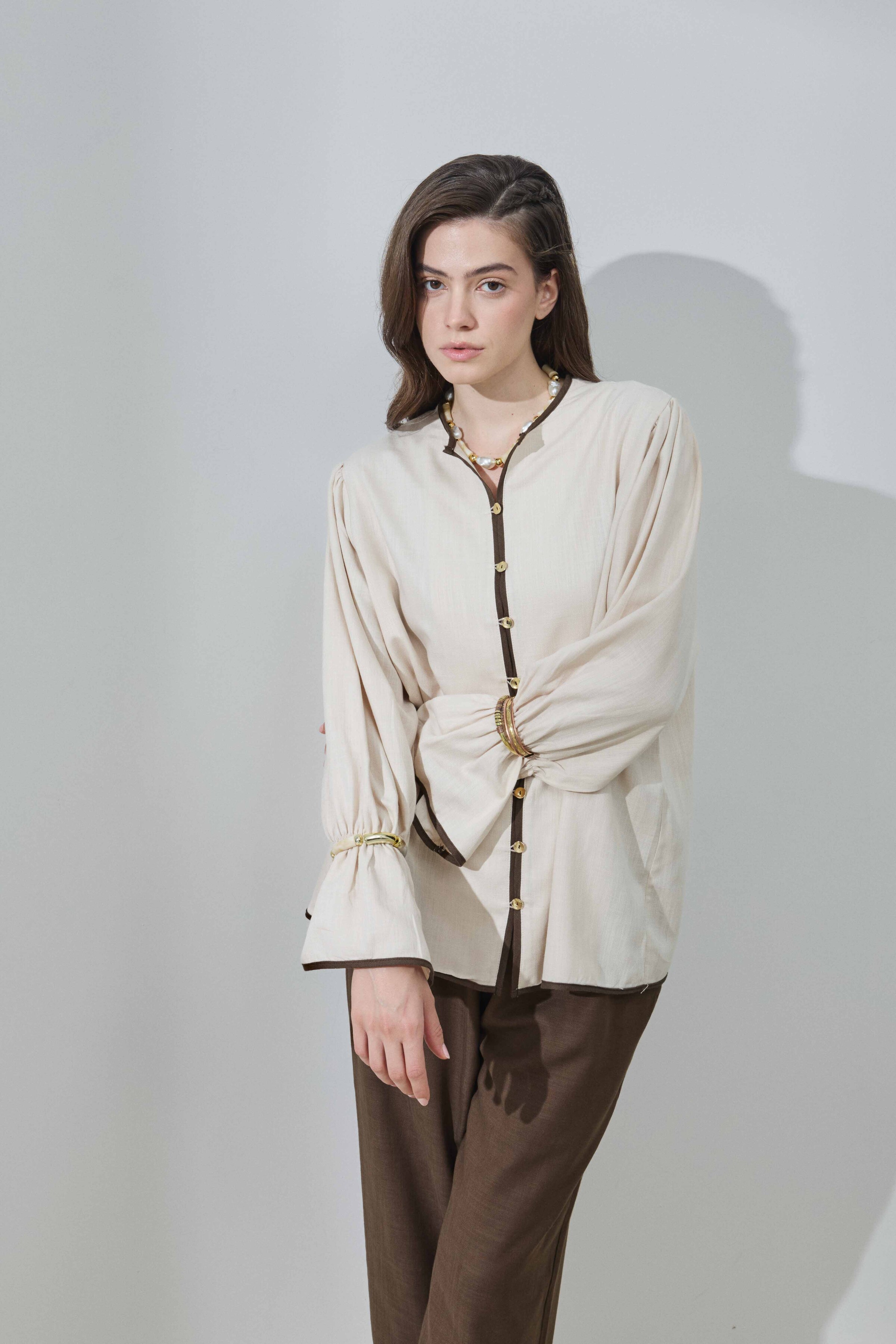 Kontrast renklerin uyumu ile görünümünü öne çıkarabileceğin biyeli gömleği ister şık ister spor kombinleyebilir bu yazın kurtarıcı parçası olarak kullanabilirsin. Ethereal Roots koleksiyonunun minimal ve zamansız çizgilerini taşıyan doğal kumaş kontrast biyeli gömlek uzun yıllar seninle!