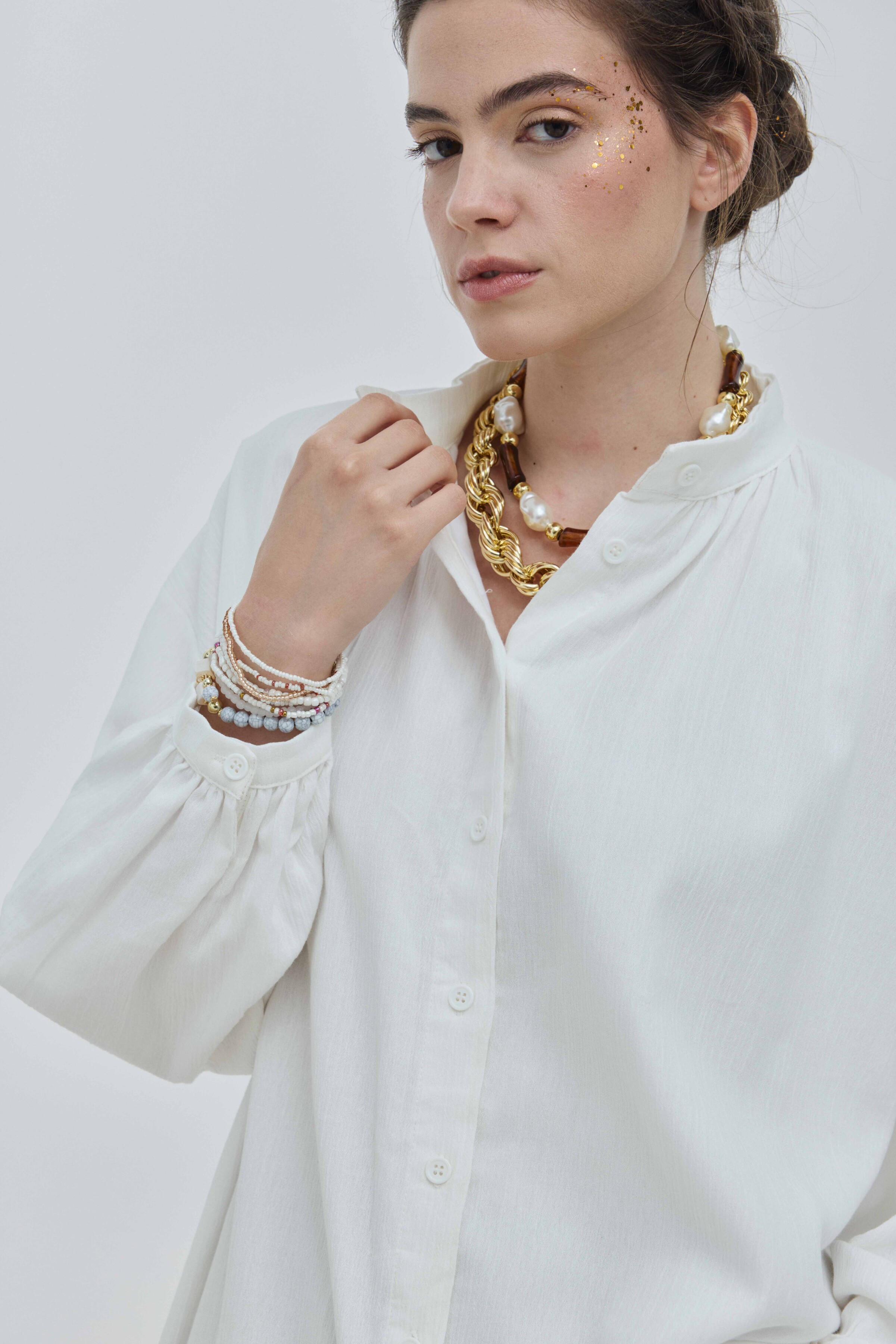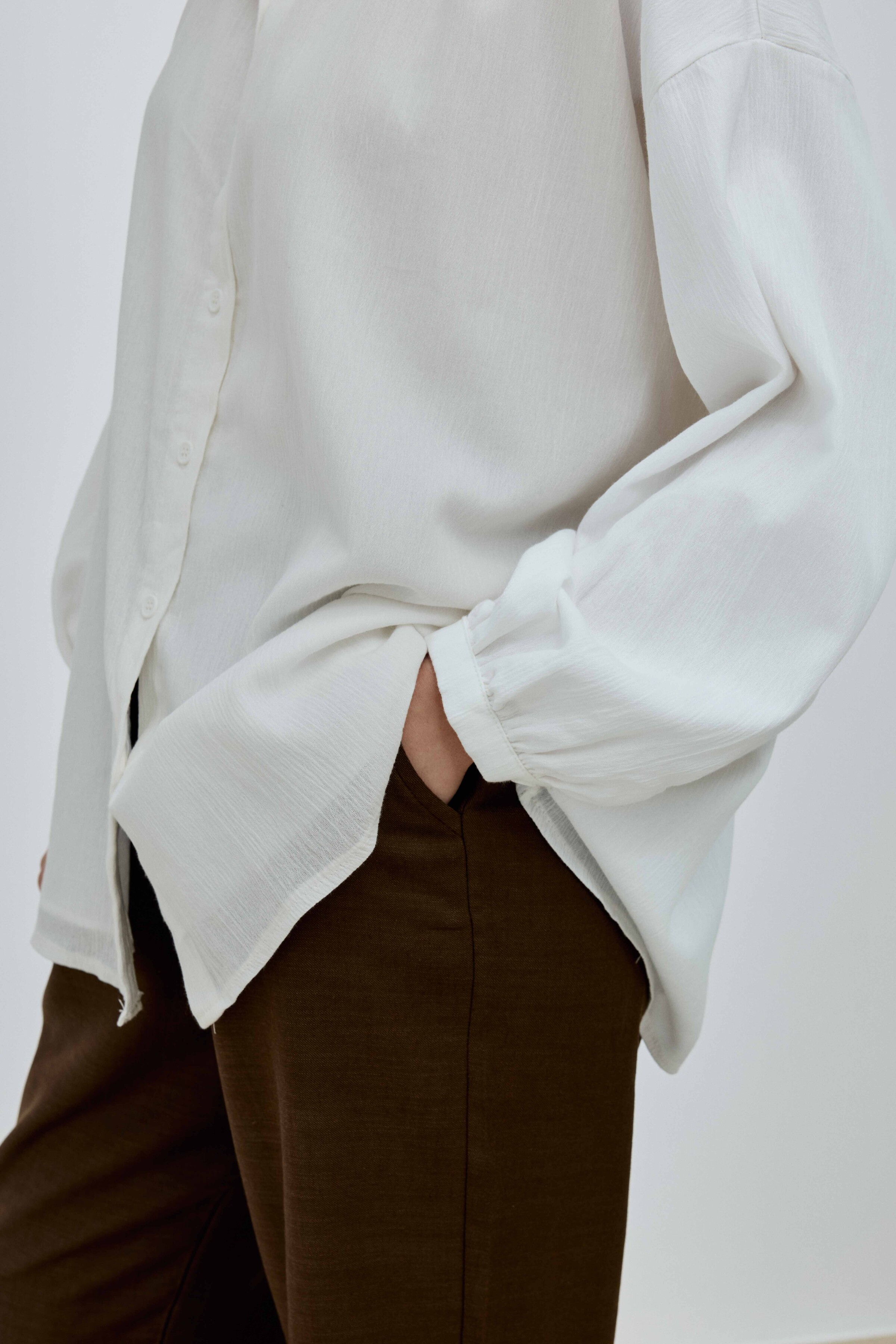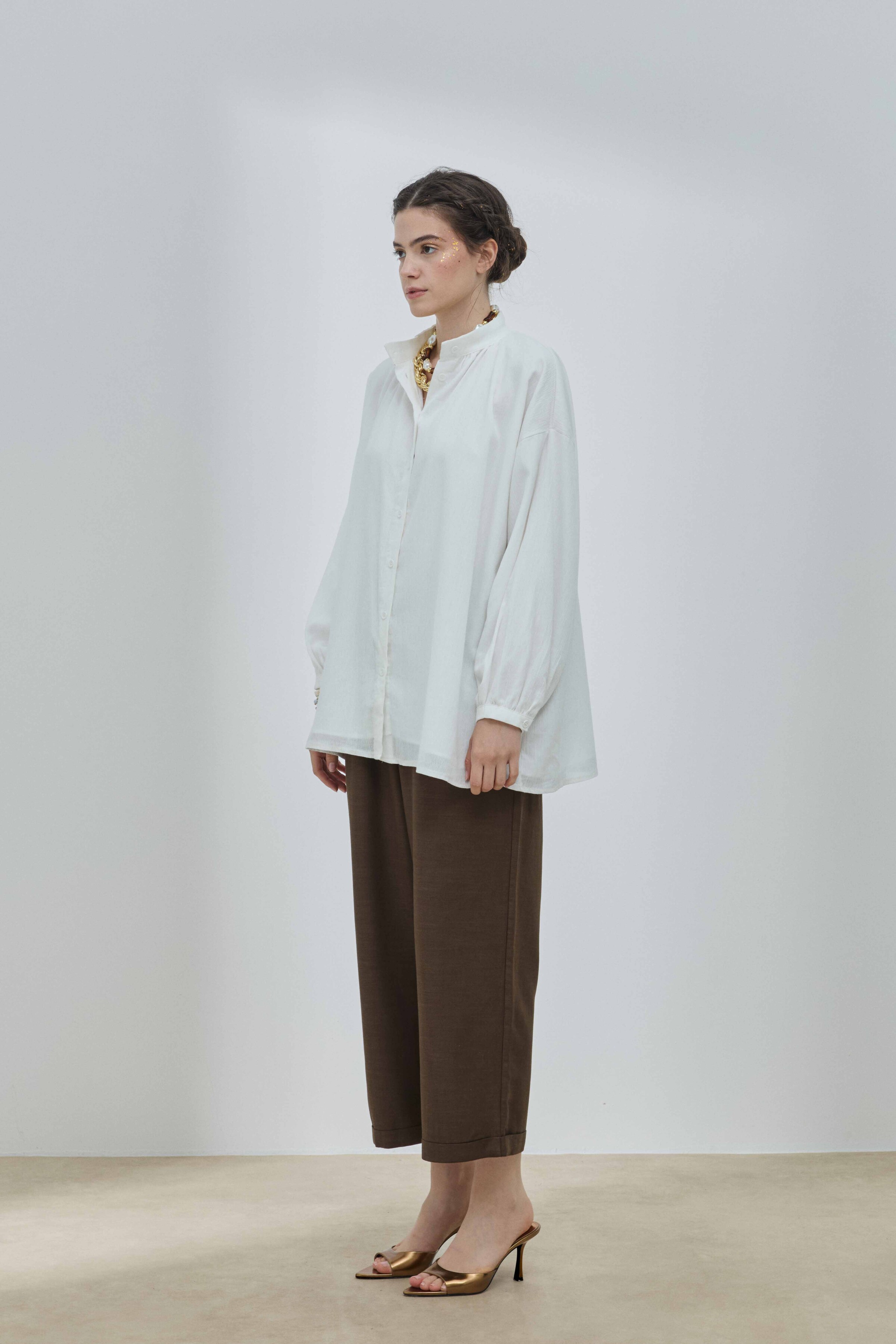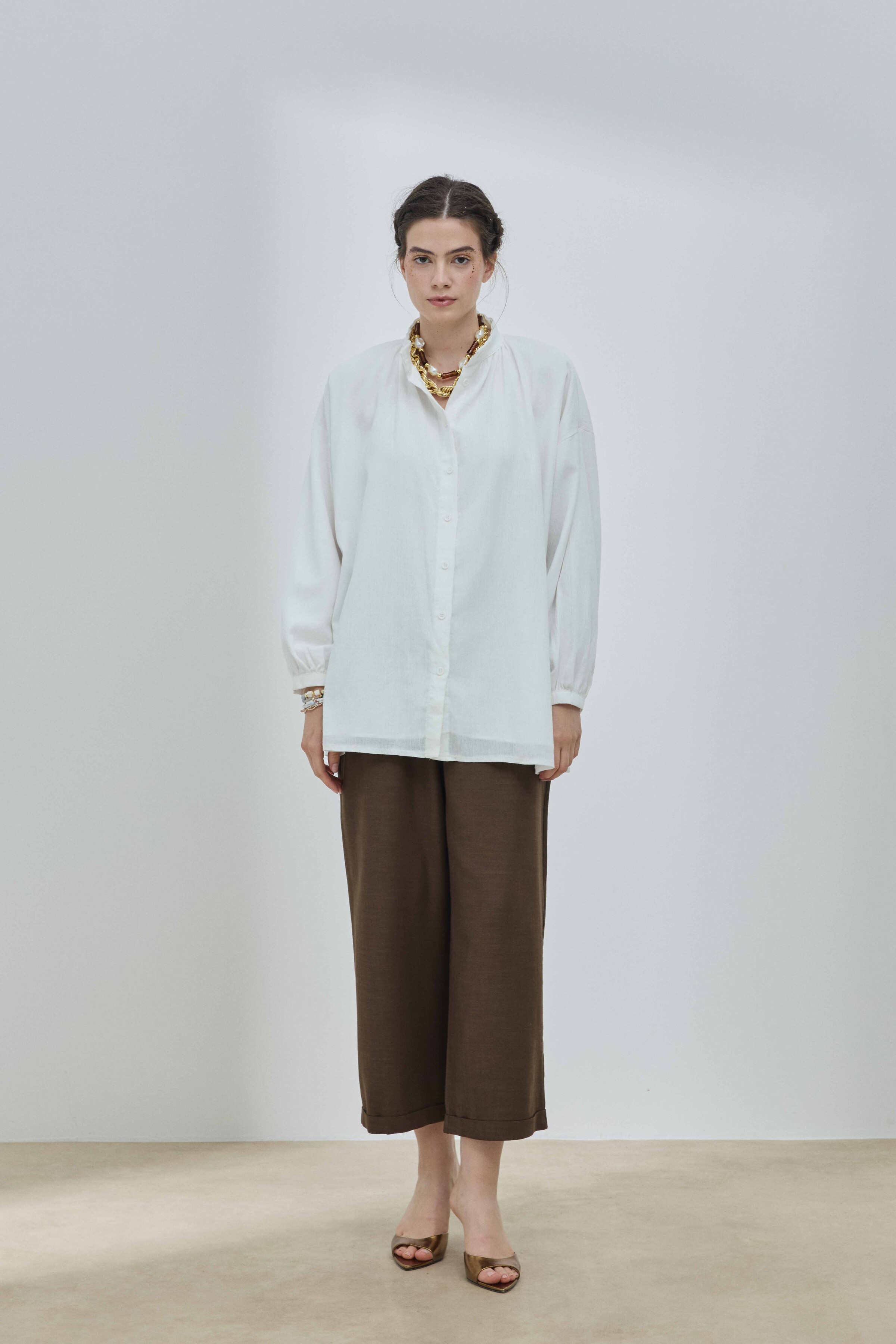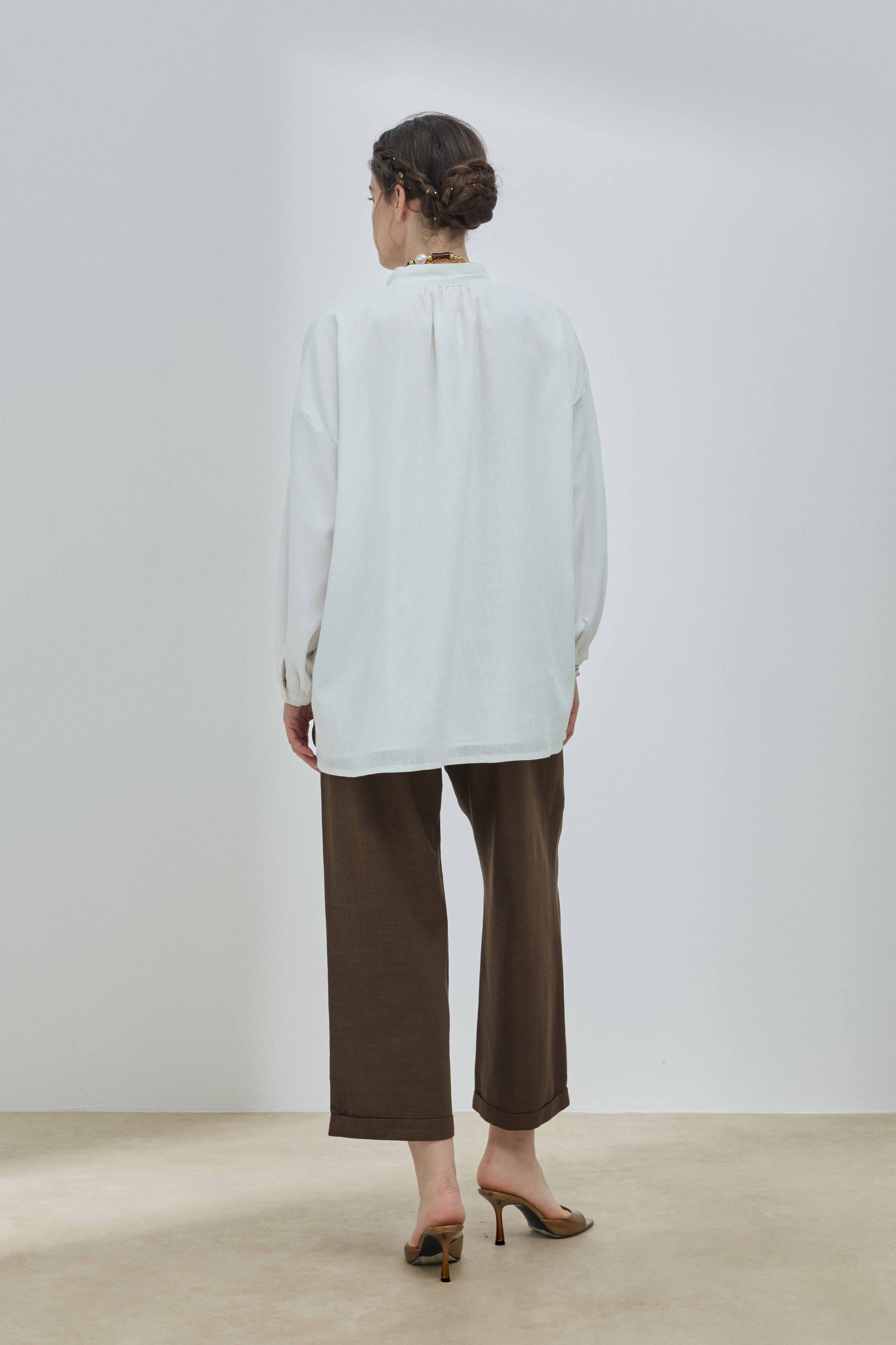 Gömlek, klasik gömlek yaka, manşet ve düğme detaylarına sahiptir; ancak bu detaylar minimalist bir yaklaşımla tasarlanmıştır. Bu sade yapı, gömleğin dökümünün ve kumaşının doğal güzelliğinin ön plana çıkmasını sağlar. Gömleğin bu geleneksel detayları, ona yapılandırılmış ve düzenli bir hava katarken, Şile bezinin hafifliği bu yapıyı yumuşatır ve günlük kullanıma uygun hale getirir. Gömleğin uzunluğu ve kalıbı, onu aynı zamanda ideal bir katmanlama parçası yapar. Bu ince düşünülmüş tasarım, gömleğin hem görsel açıdan zarif hem de günlük kullanımda işlevsel olmasını sağlar.