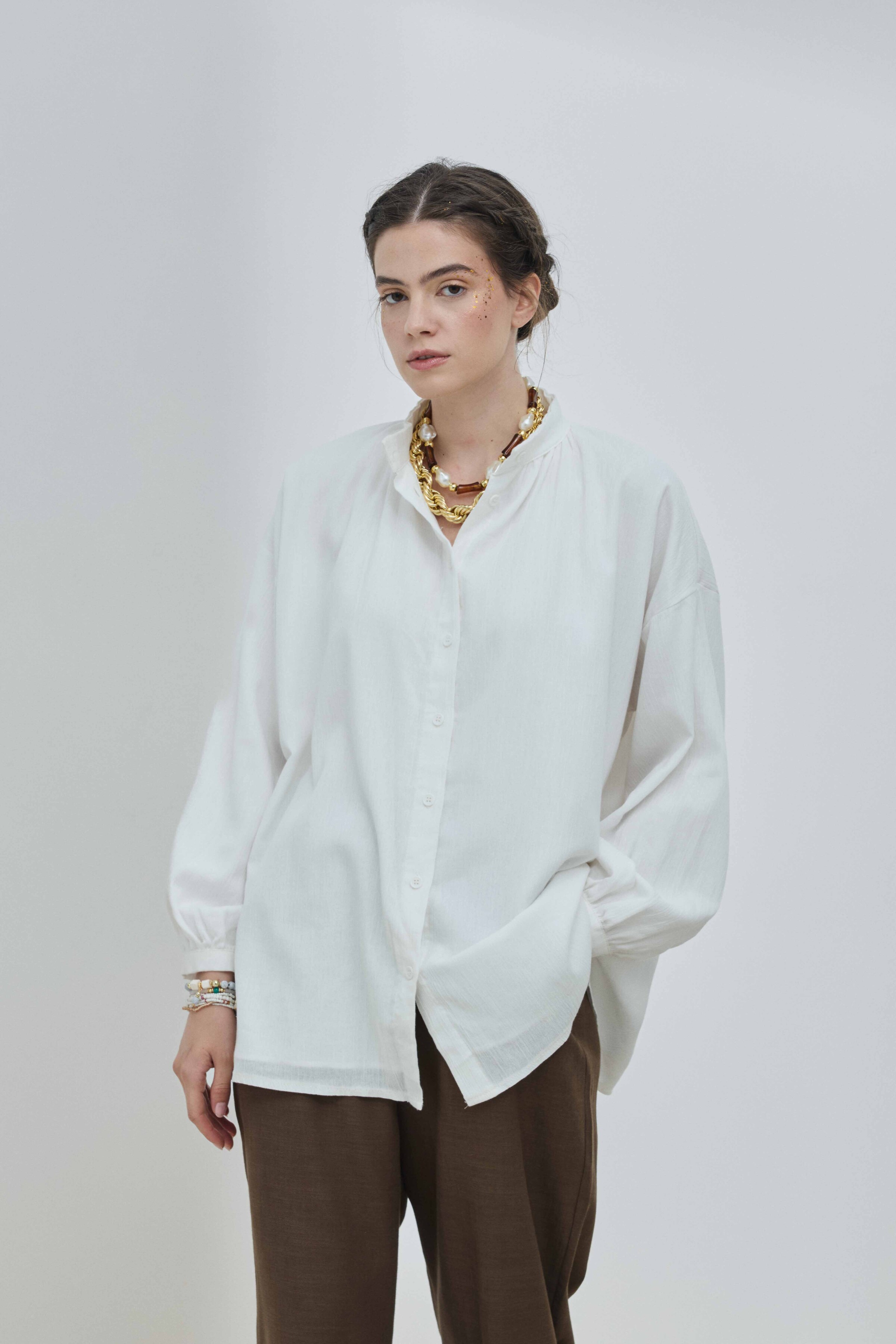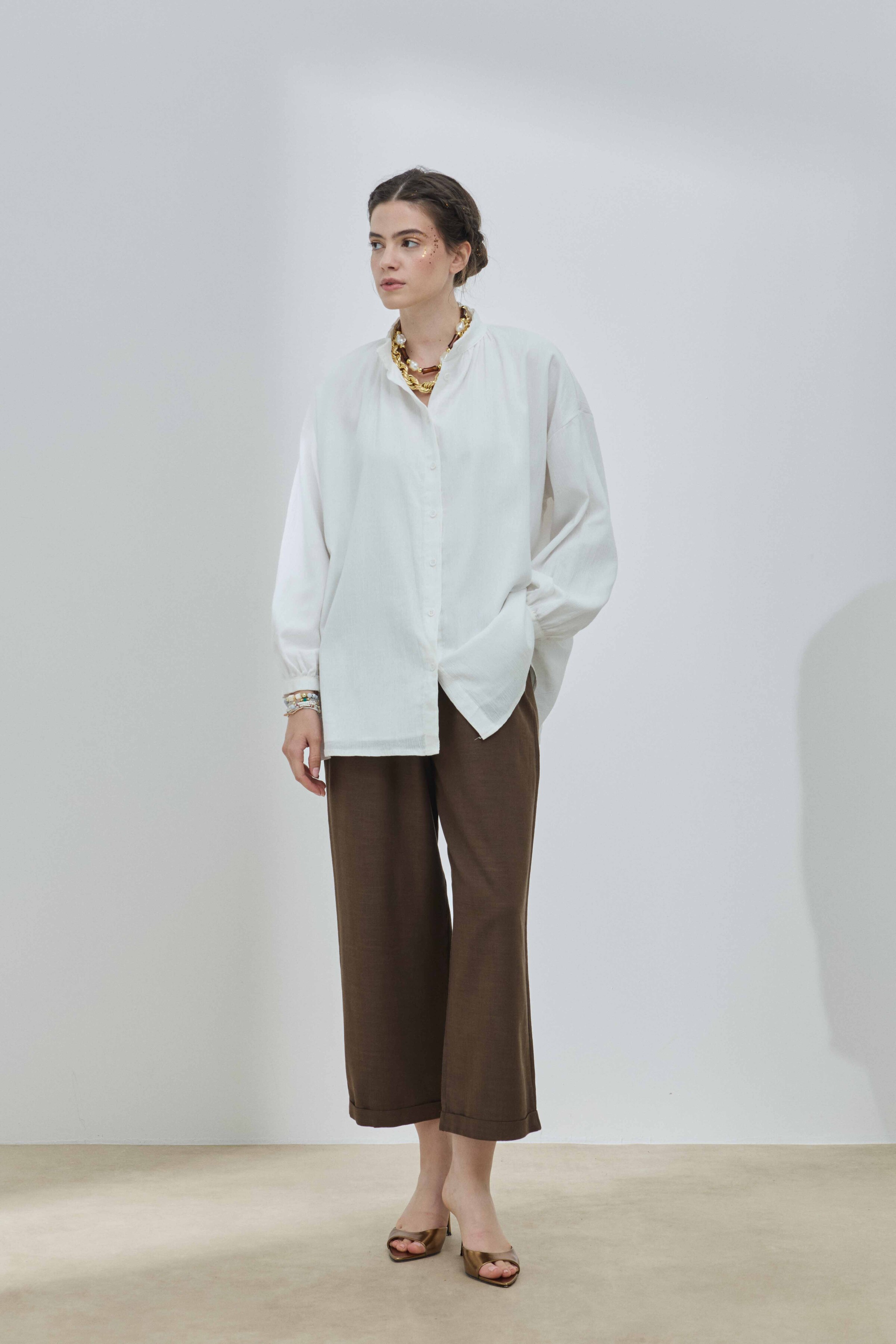 Gömleğin kalıbı, bedene yapışmayan, modern ve rahat (relaxed fit) bir kesime sahiptir. Bu akışkan kesim, hareket özgürlüğünü kısıtlamadan çabasız bir şıklık sunar. Şile bezinin hafifliği ve dökümlü yapısı sayesinde, gömlek vücutta zarif bir şekilde akar ve hareketlerinize eşlik eder. Bu rahat kalıp, onu hem tek başına iliklenerek hem de bir tişört üzerine dış katman olarak giymek için ideal hale getirir. Gömleğin basit ama etkili tasarımı, sade ve zarif bir estetik arayanlar için mükemmeldir; sadelikten gelen gücü yansıtır.