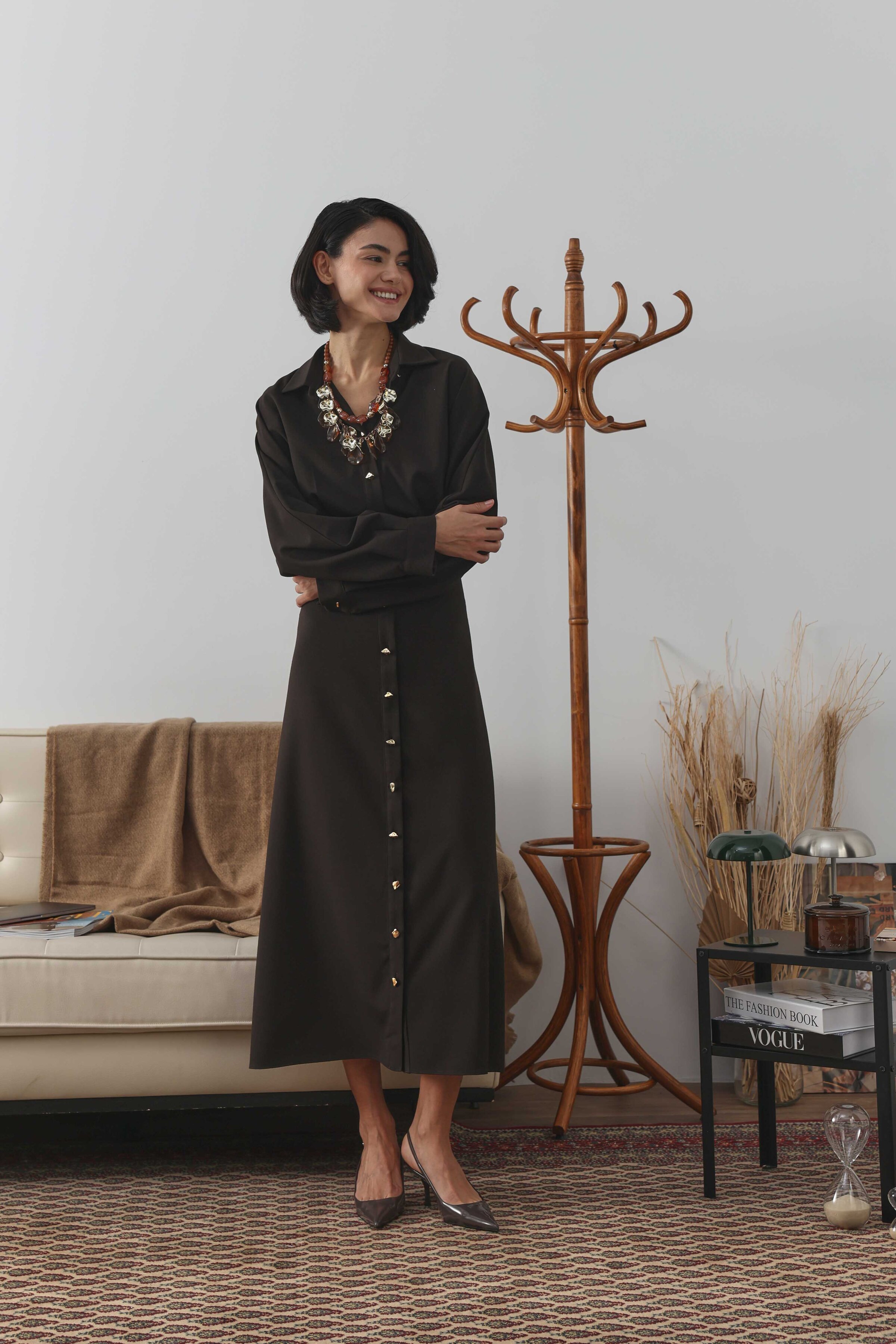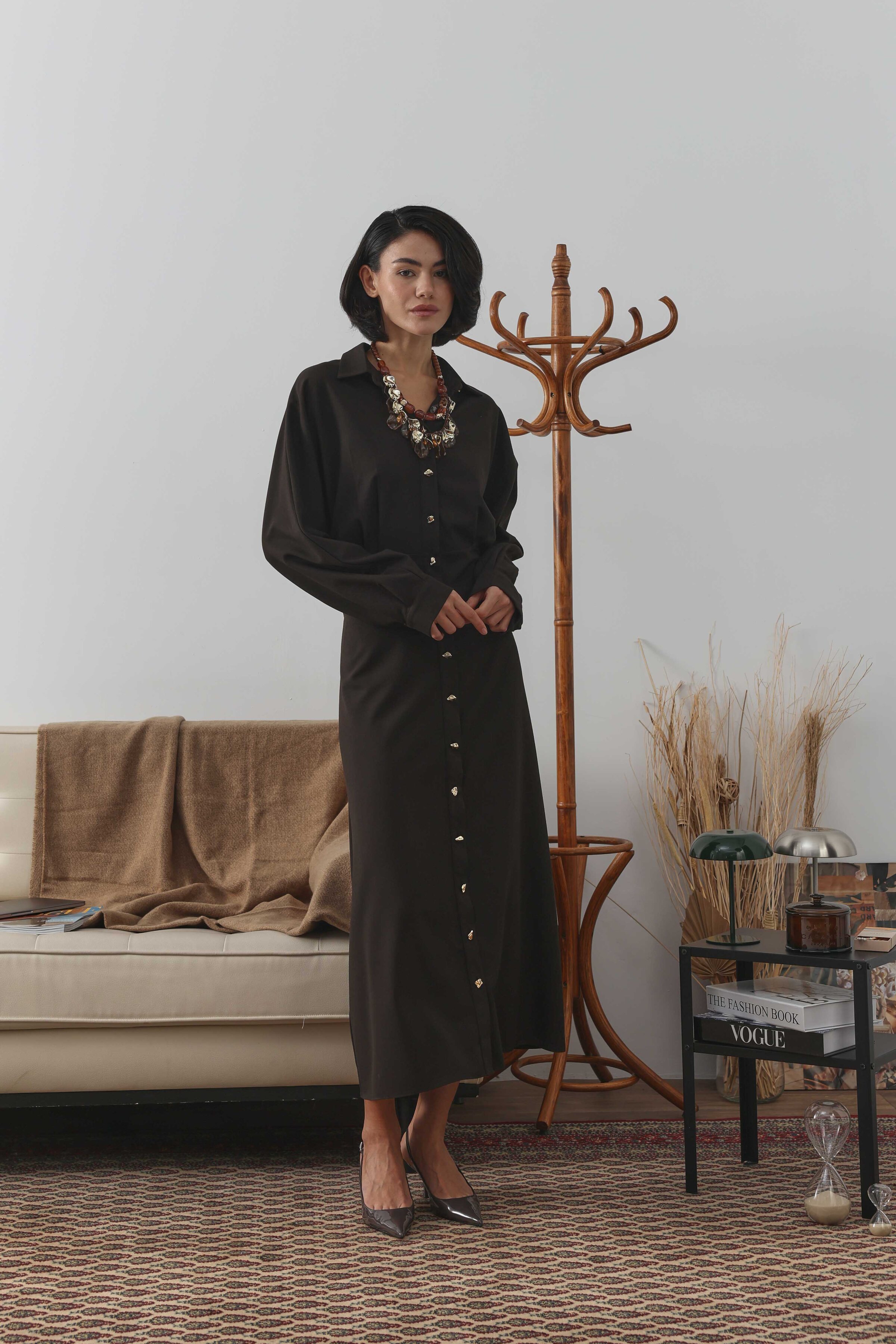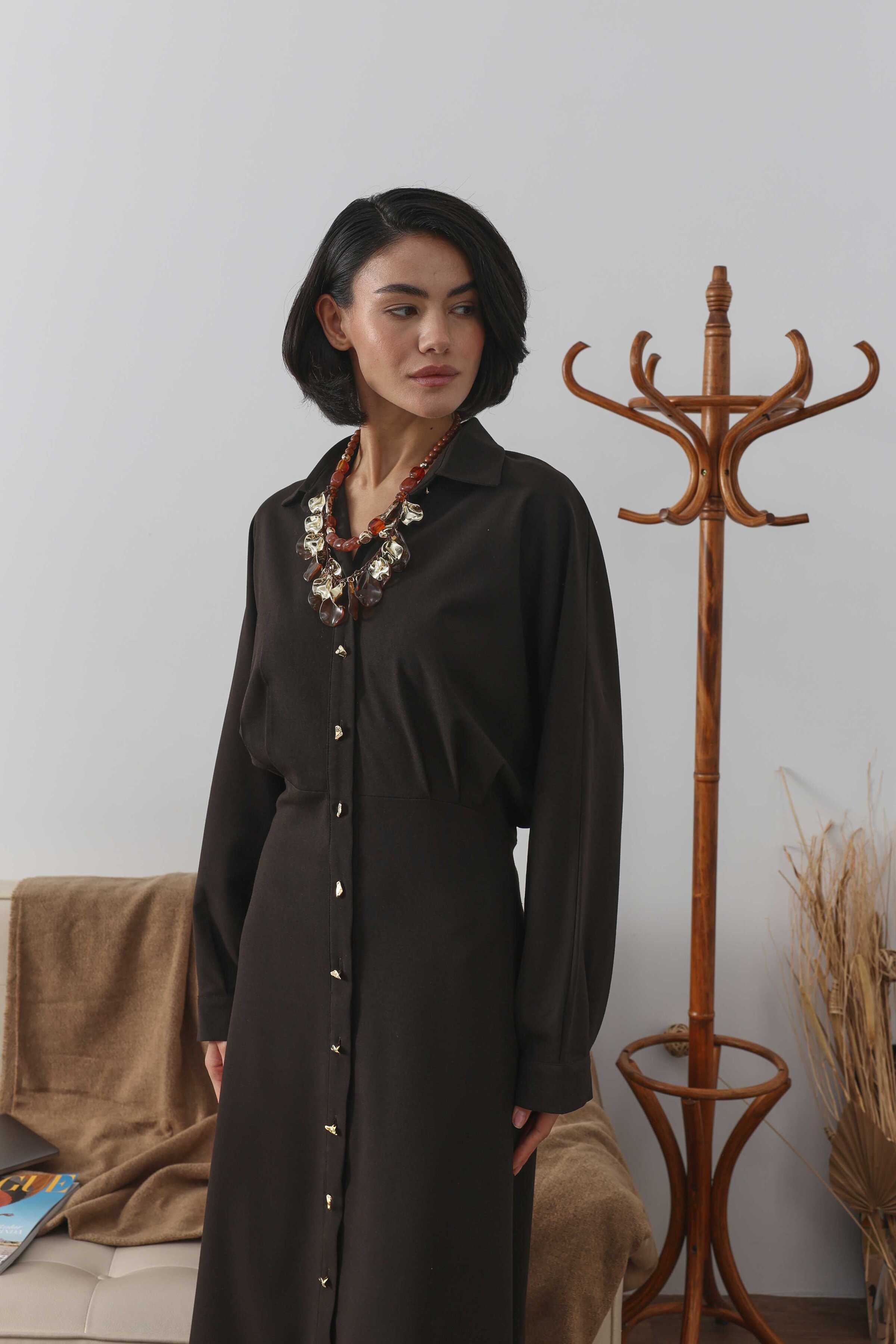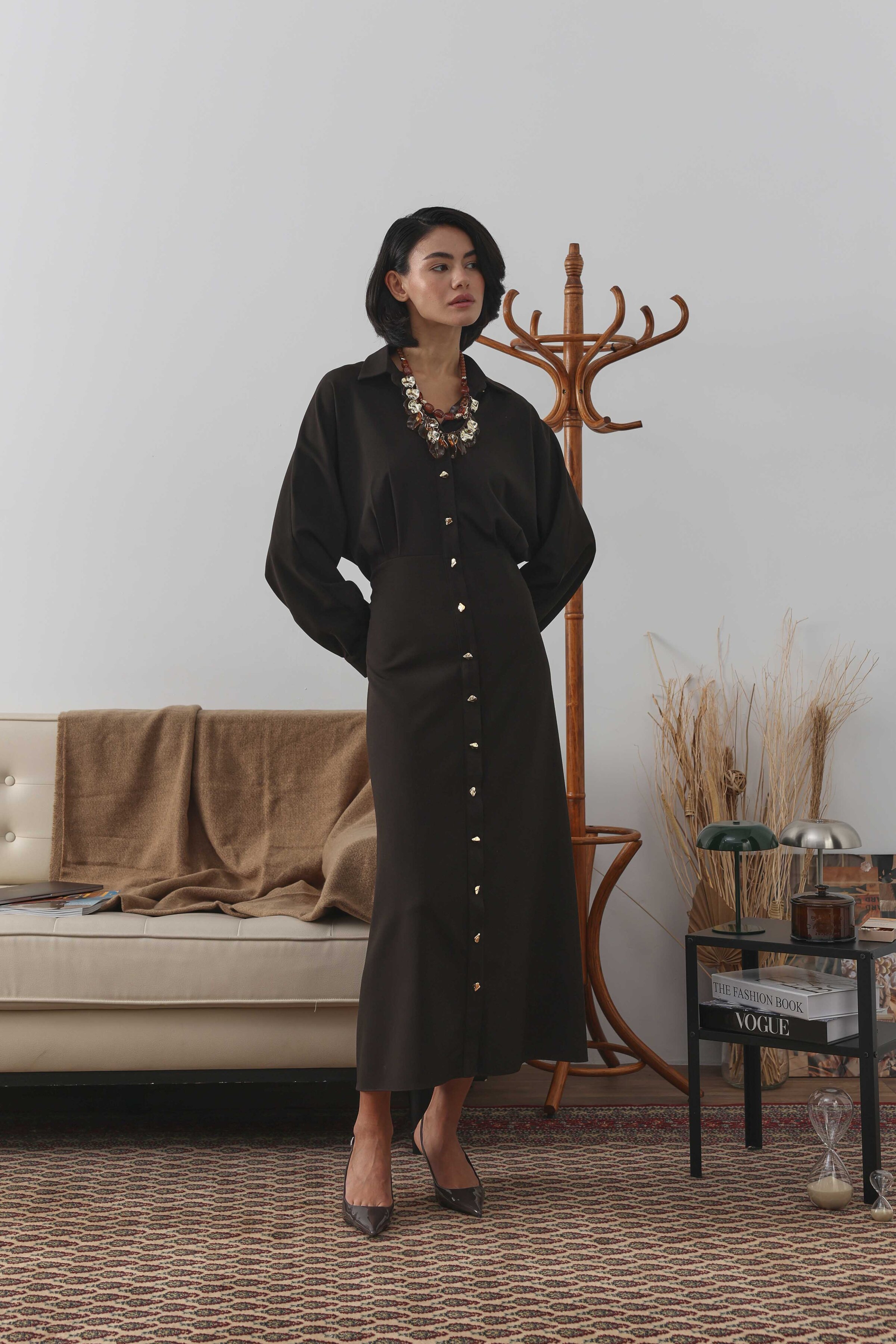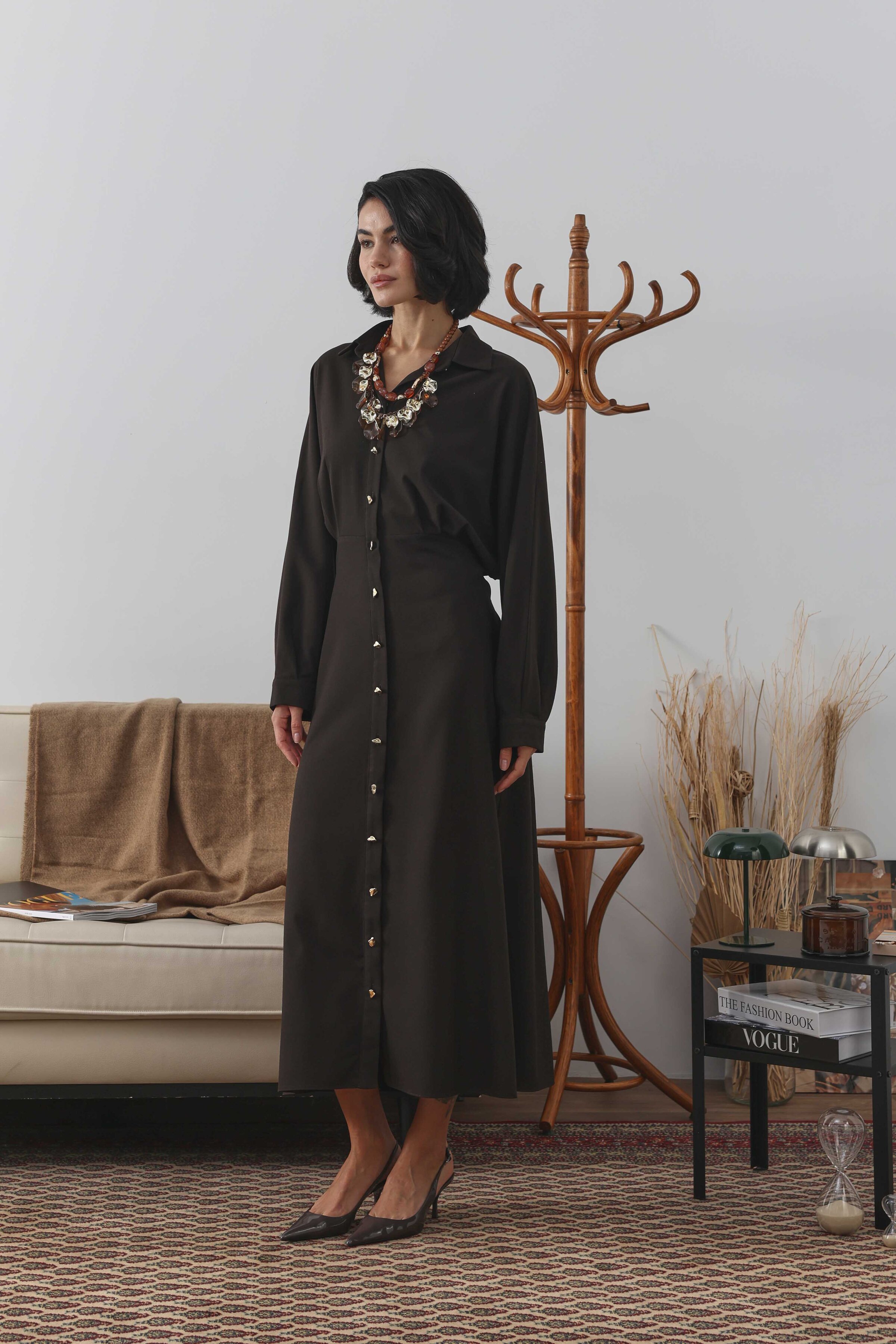 Sonbahar kışa özel üretilmiş kumaş, metal düğmelerin ışıltısı ve zarif bel detayının birleşimiyle hem rahatlığı deneyimle hem de zamansız bir şıklıkta ol!