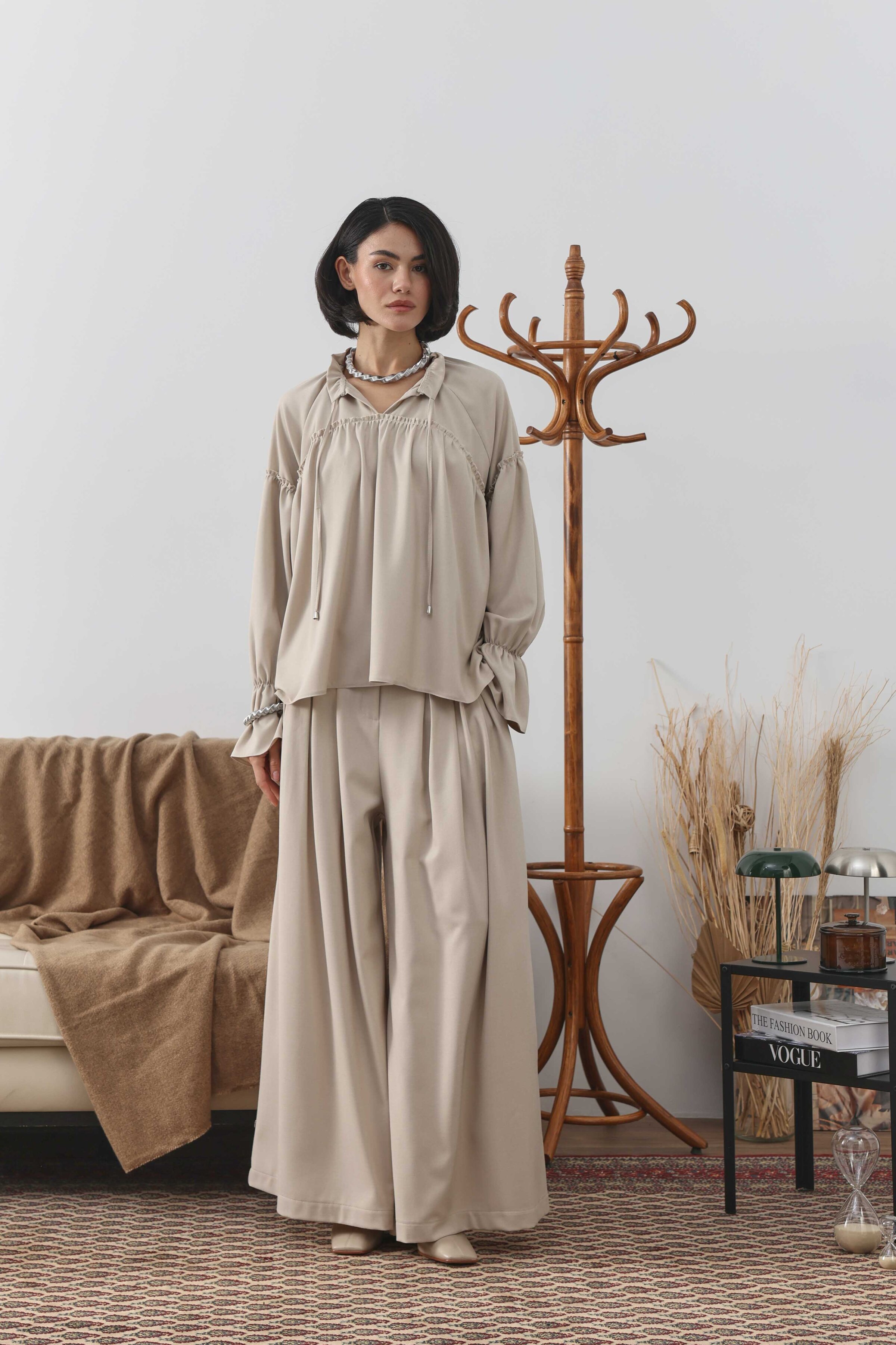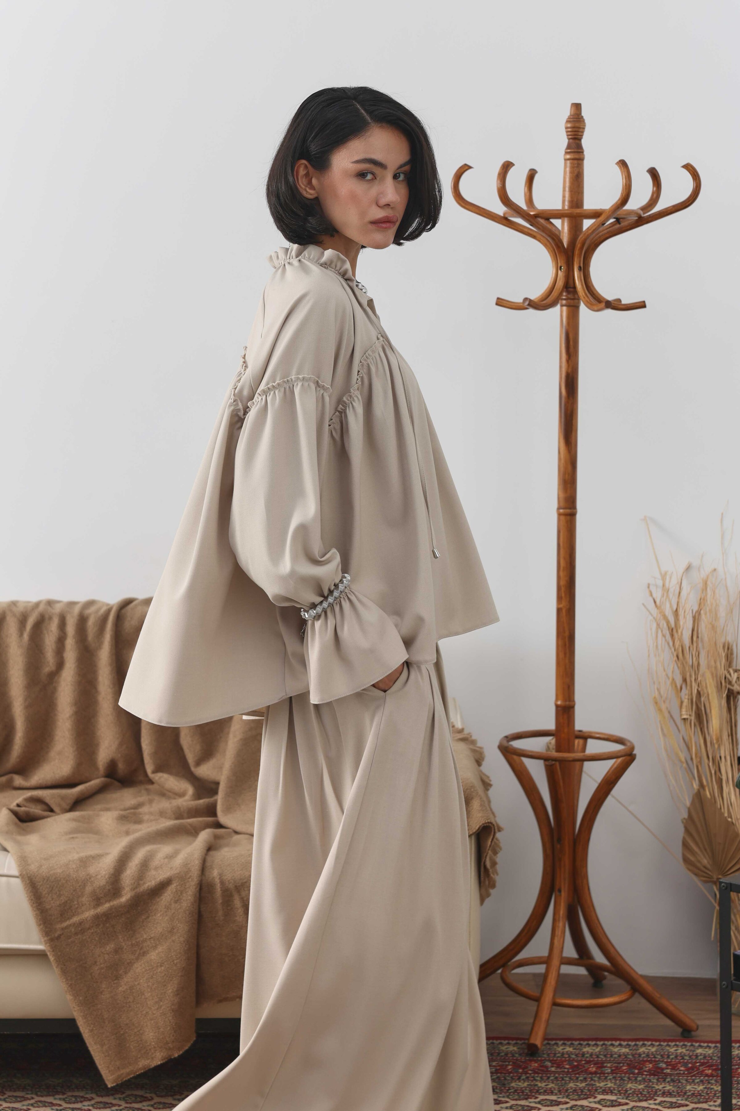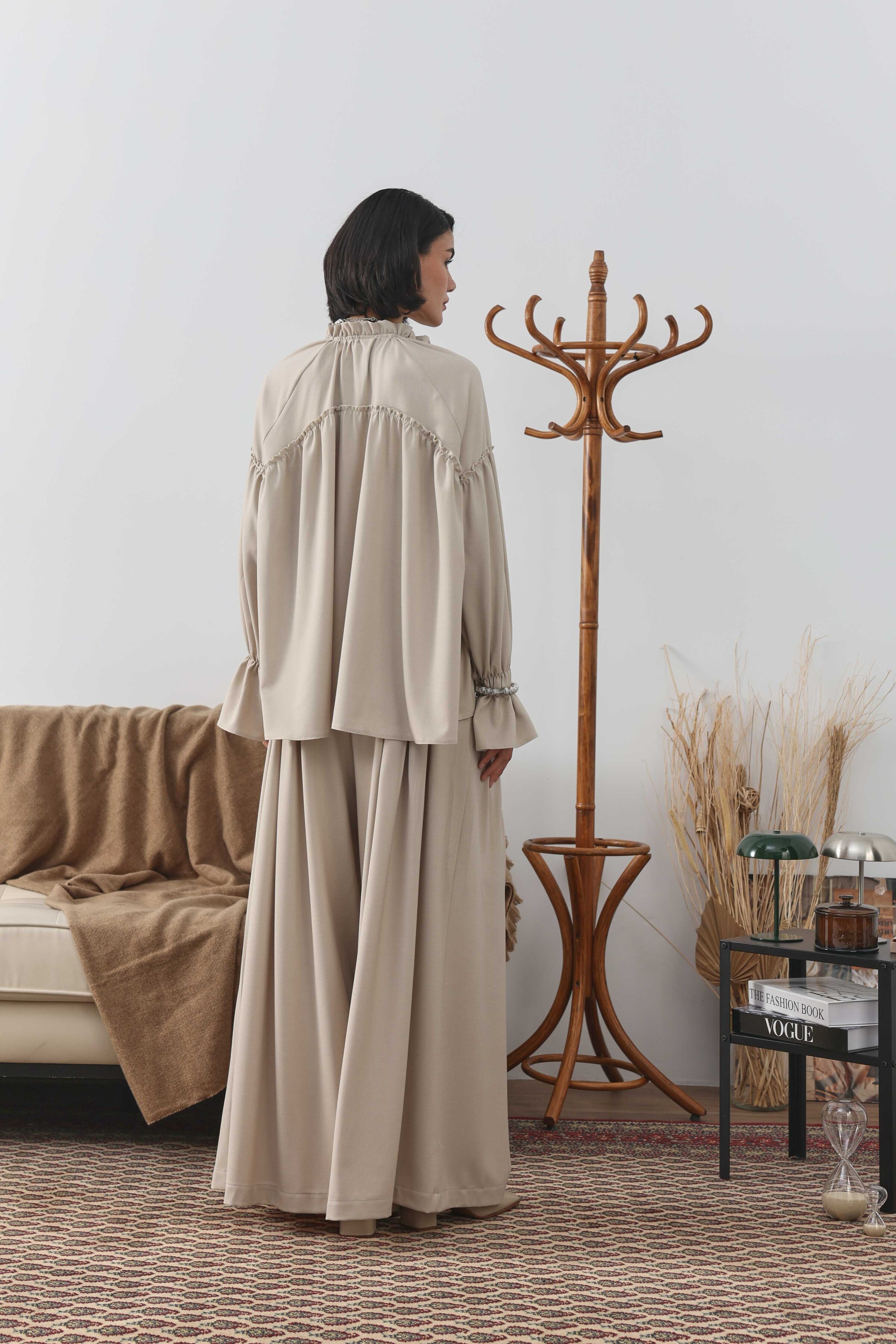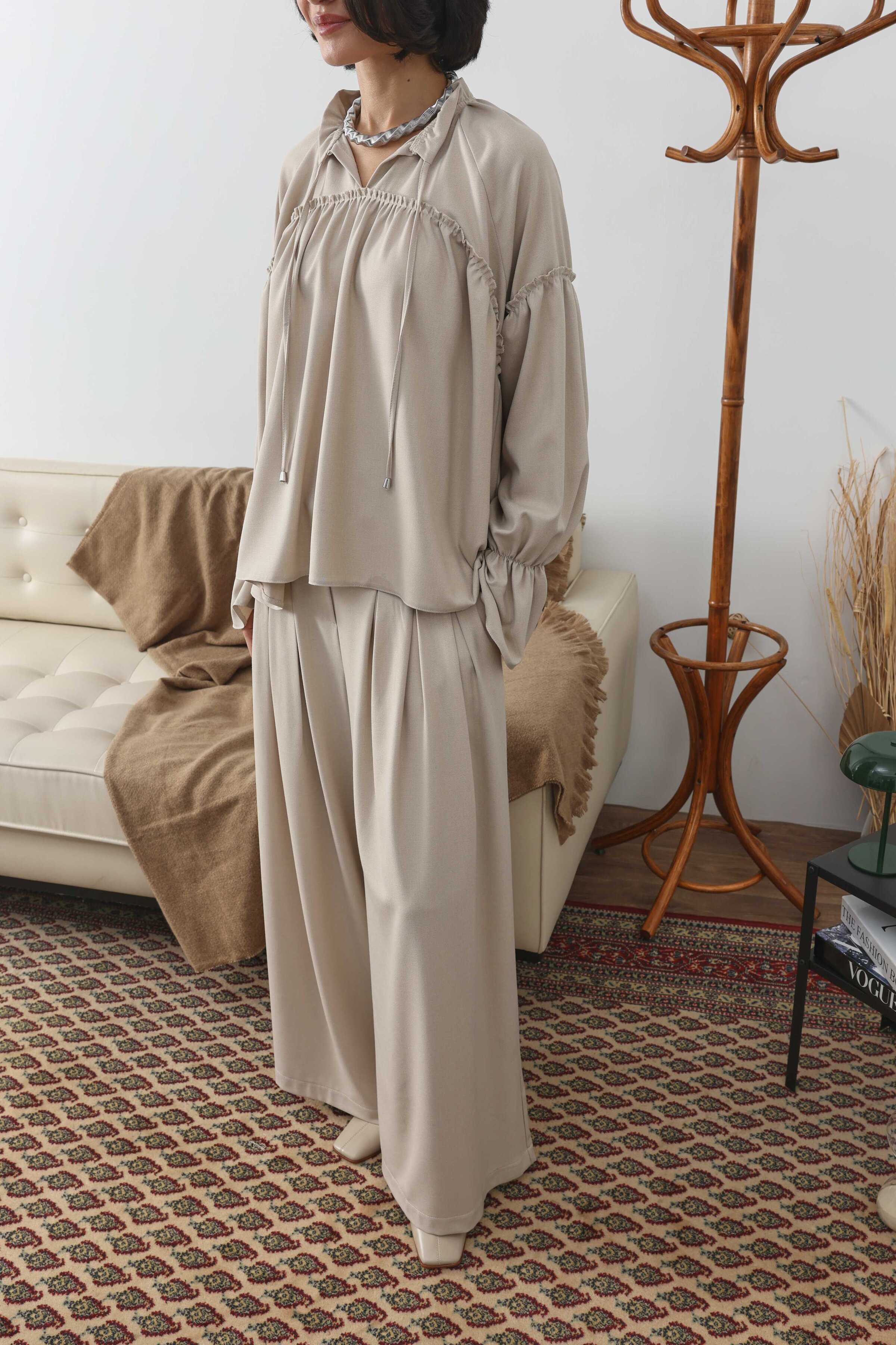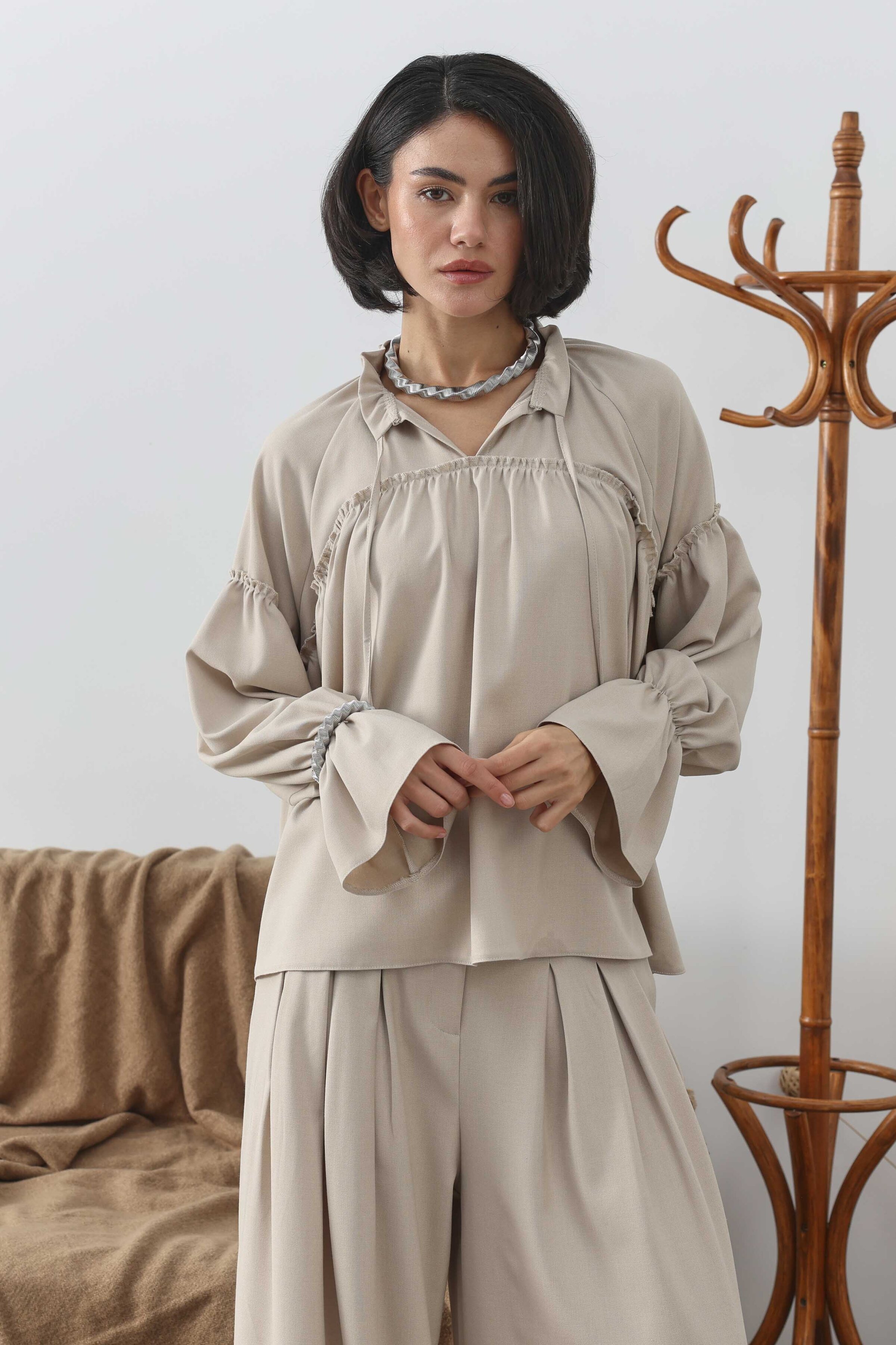 Görünümüne romantik bir dokunuş yapmak istersen büzgü ve volan detaylı bluz tam sana göre. Elevated Essence koleksiyonunun minimal ve zamansız çizgilerini taşıyan büzgülü volanlı bluz uzun yıllar seninle!