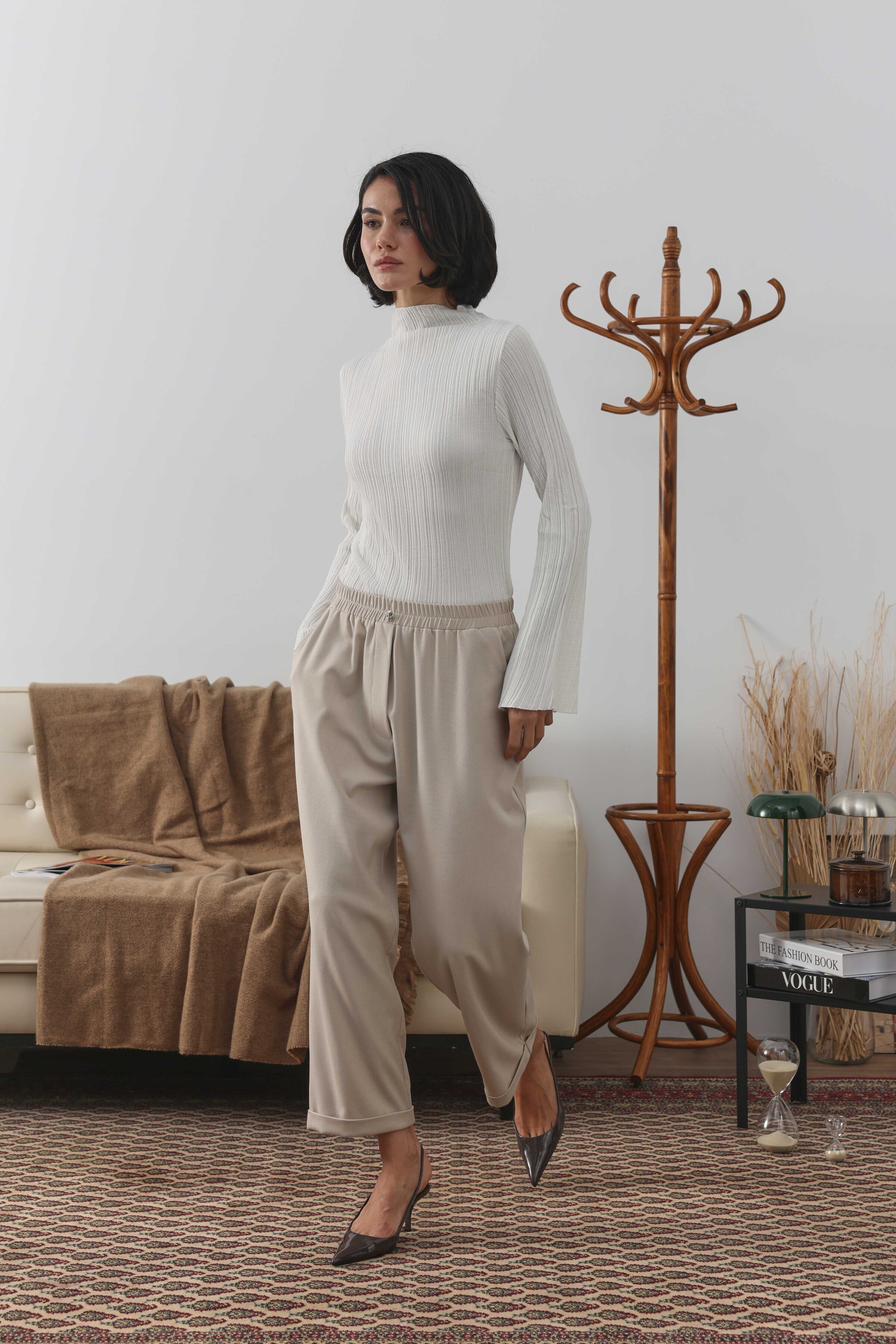 Geniş kesim pantolonun duble paça detayıyla modernize edilmiş hali, tüm kombinlerine uyum sağlayacak ve uzun yıllar sana eşlik edecek duble paça pantolon seninle! Özel dokuma kumaşın dokusu dört mevsim seni rahat hissettirecek. Elevated Essence koleksiyonundaki tüm parçalara uyum sağlayacak duble paça pantolonun zamansızlık ve rahatlığını deneyimle!