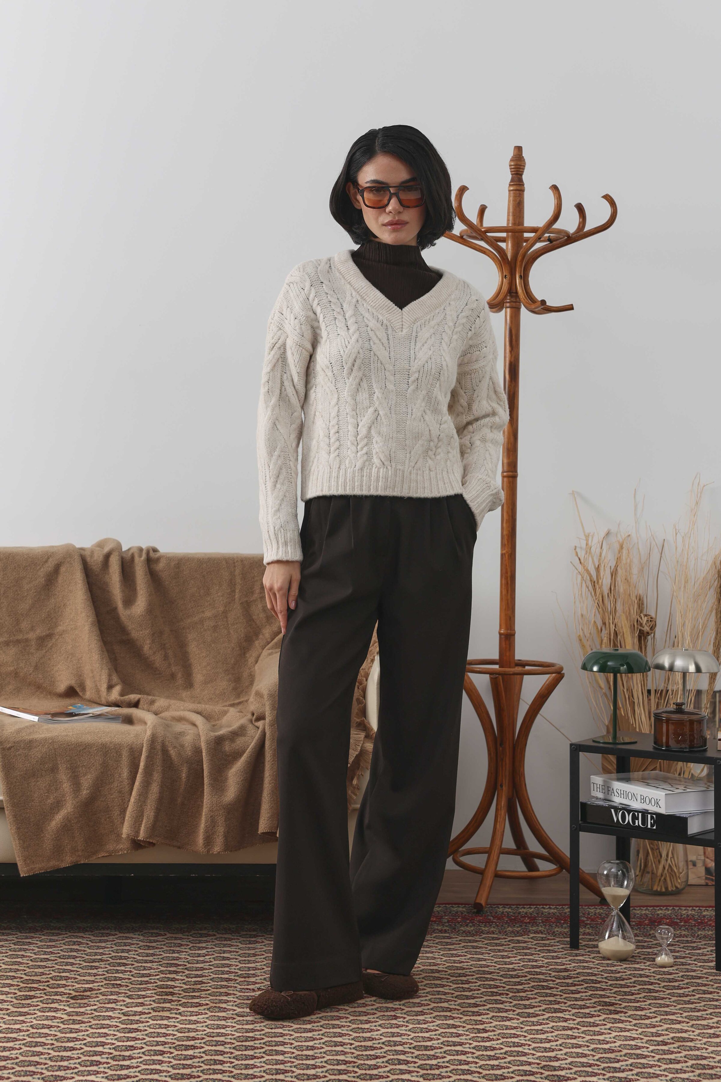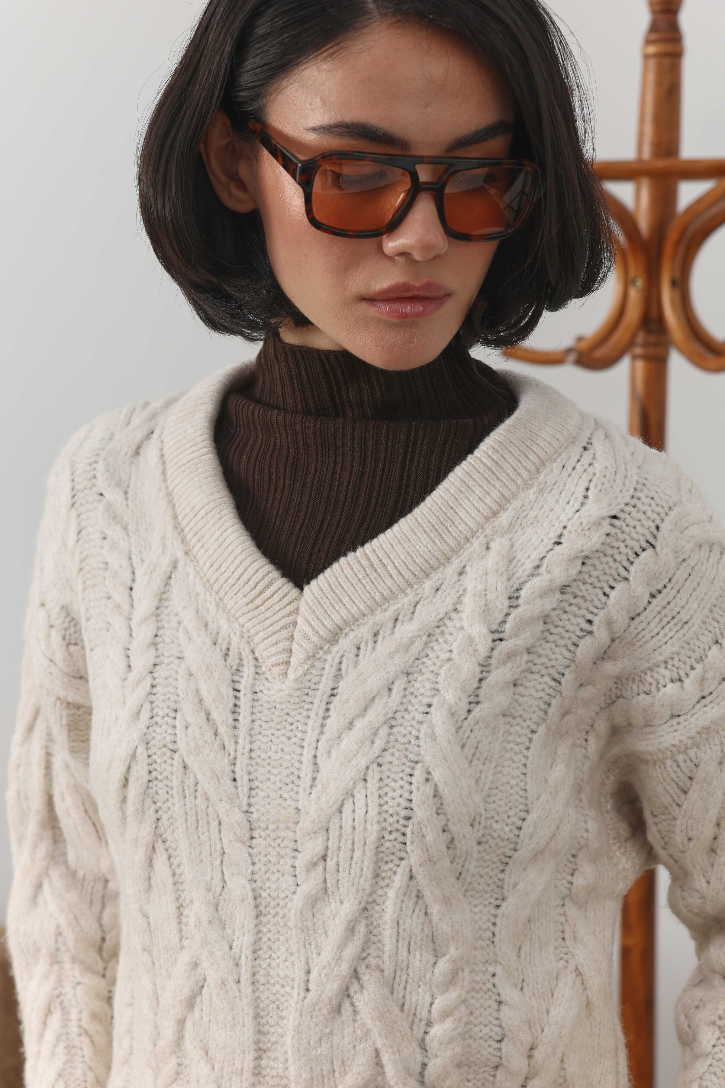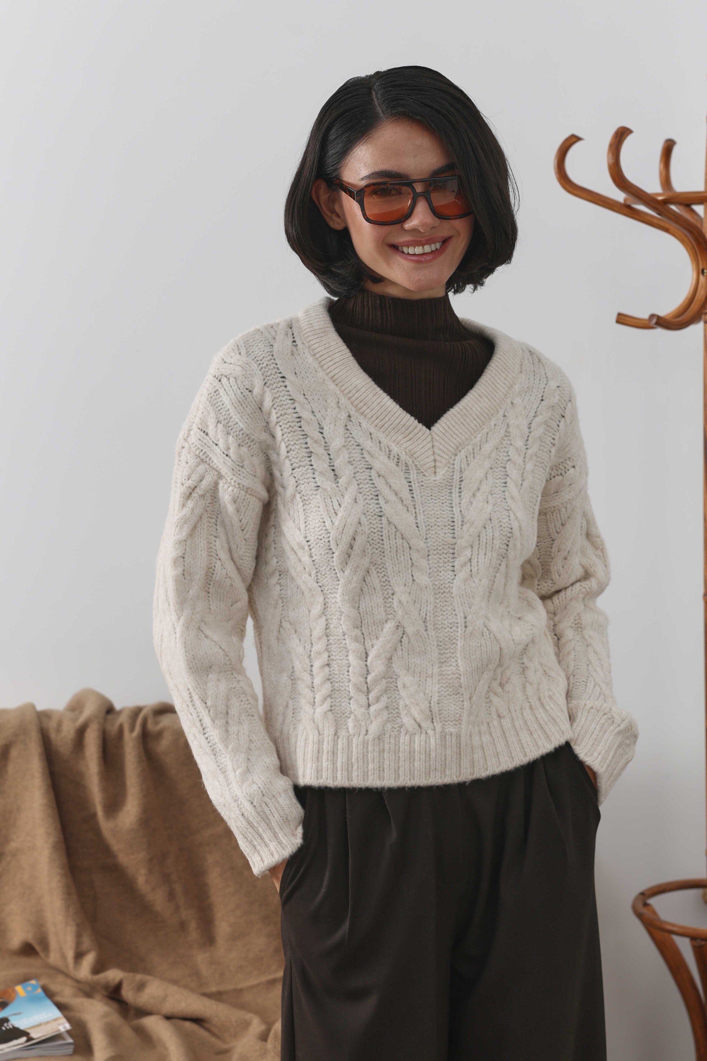 Örgülü Kısa Kazak Ekru