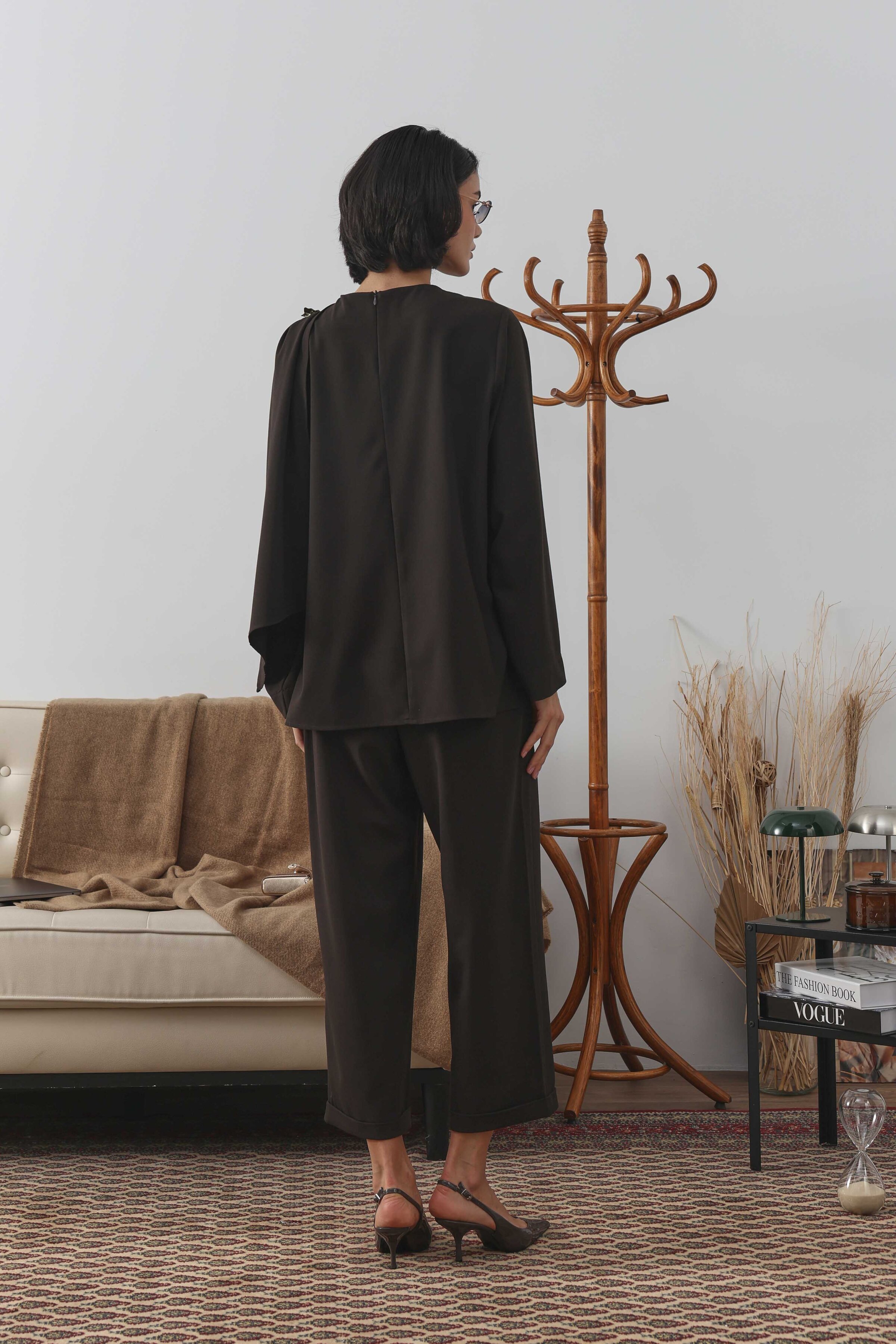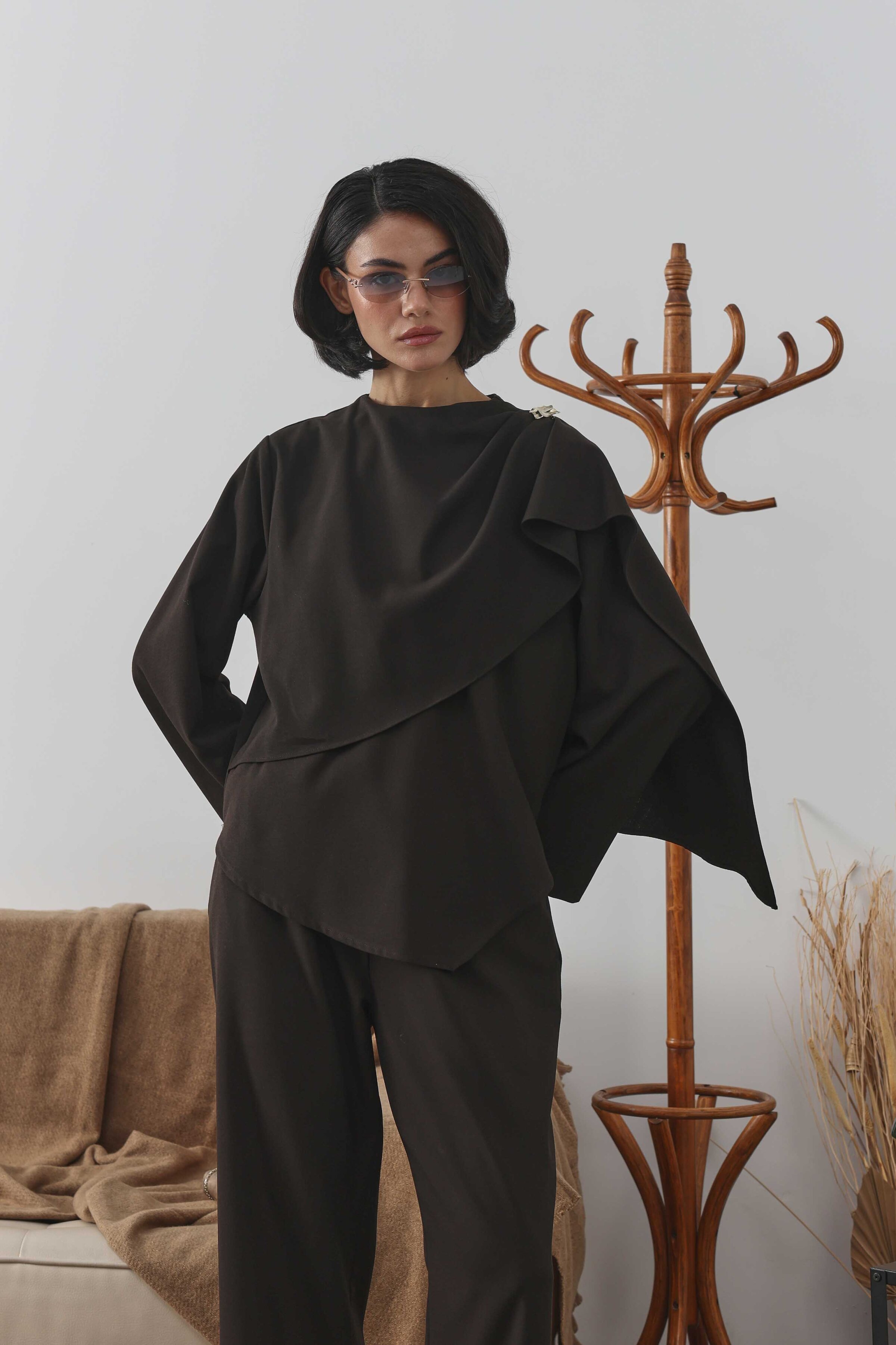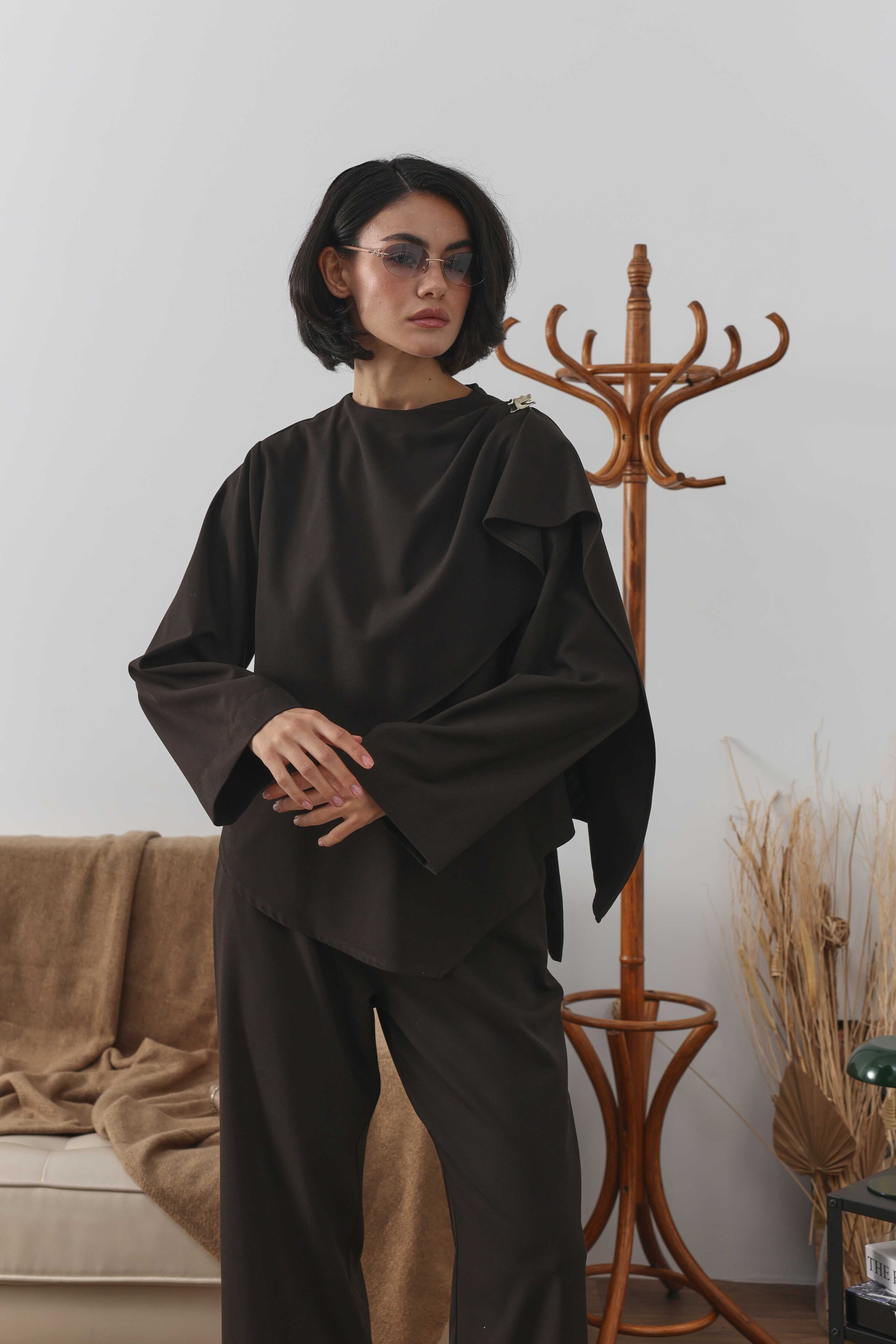 Şal ve broş detayı görünümünü bir üst seviyeye çıkartırken zamansız bluz modeli zarafetiyle dolabının vazgeçilmezi olacak. Özel dokuma sonbahar kışa özel kumaşın dokusu dört mevsim seni rahat hissettirecek. Elevated Essence koleksiyonunun minimal ve zamansız çizgilerini taşıyan şal detaylı bluz uzun yıllar seninle!