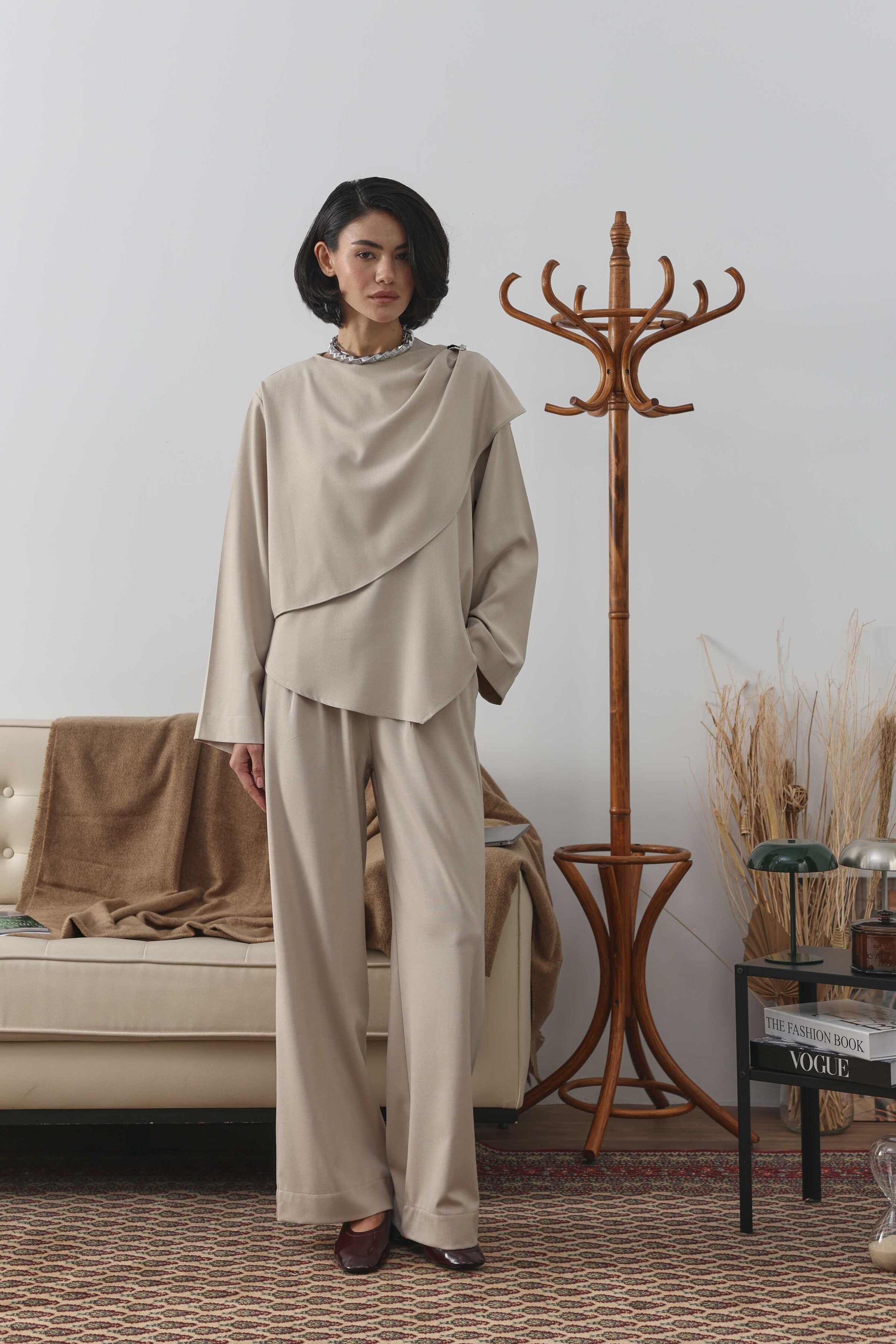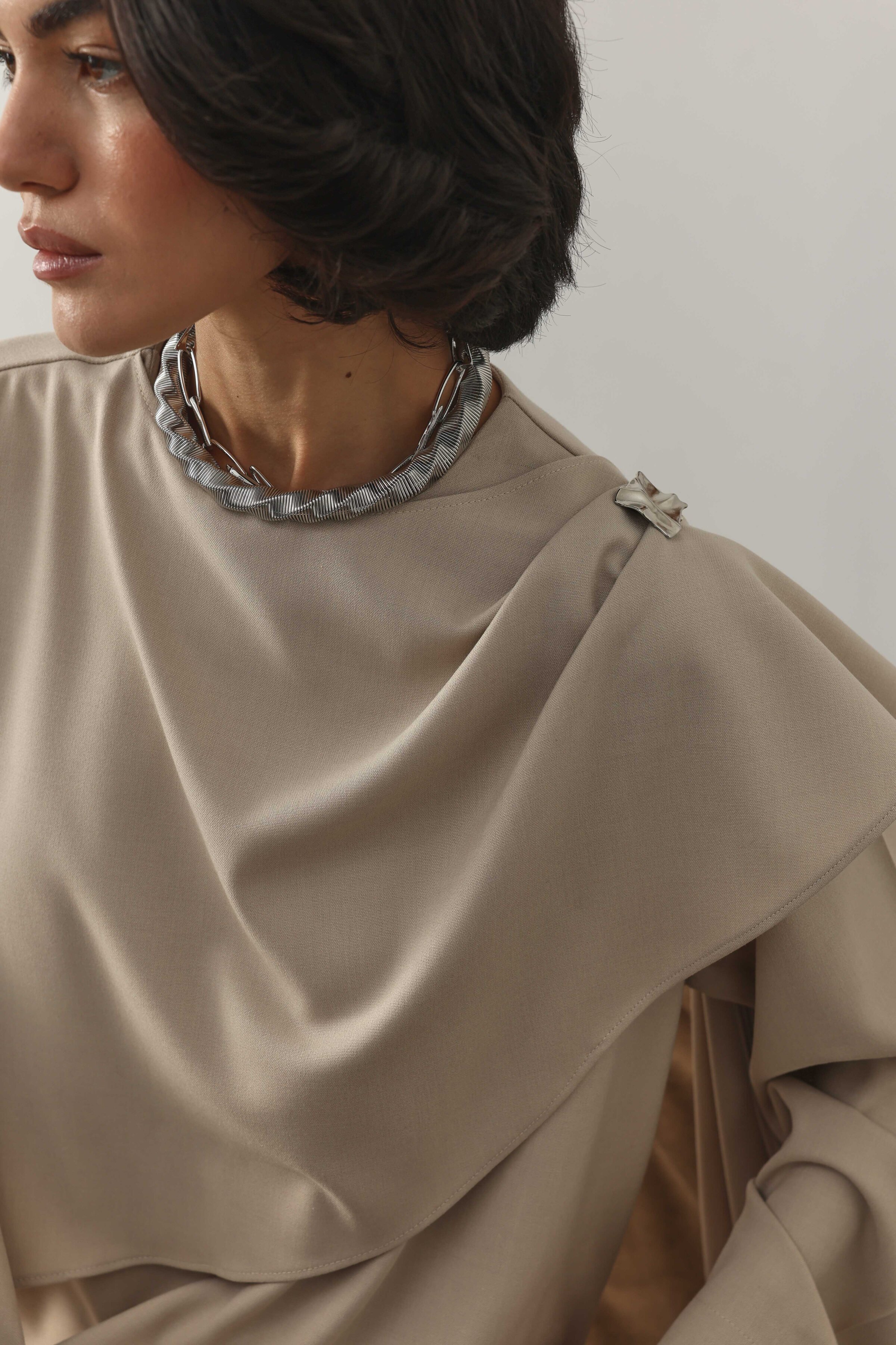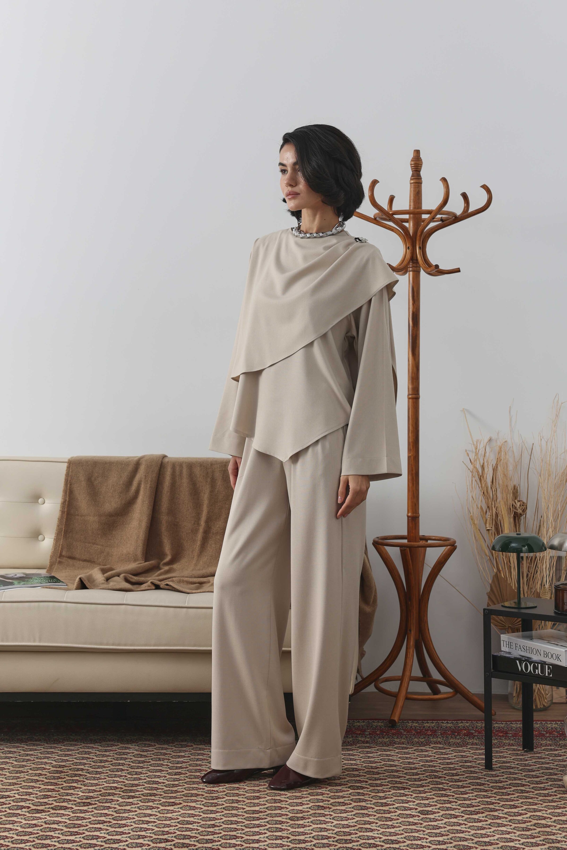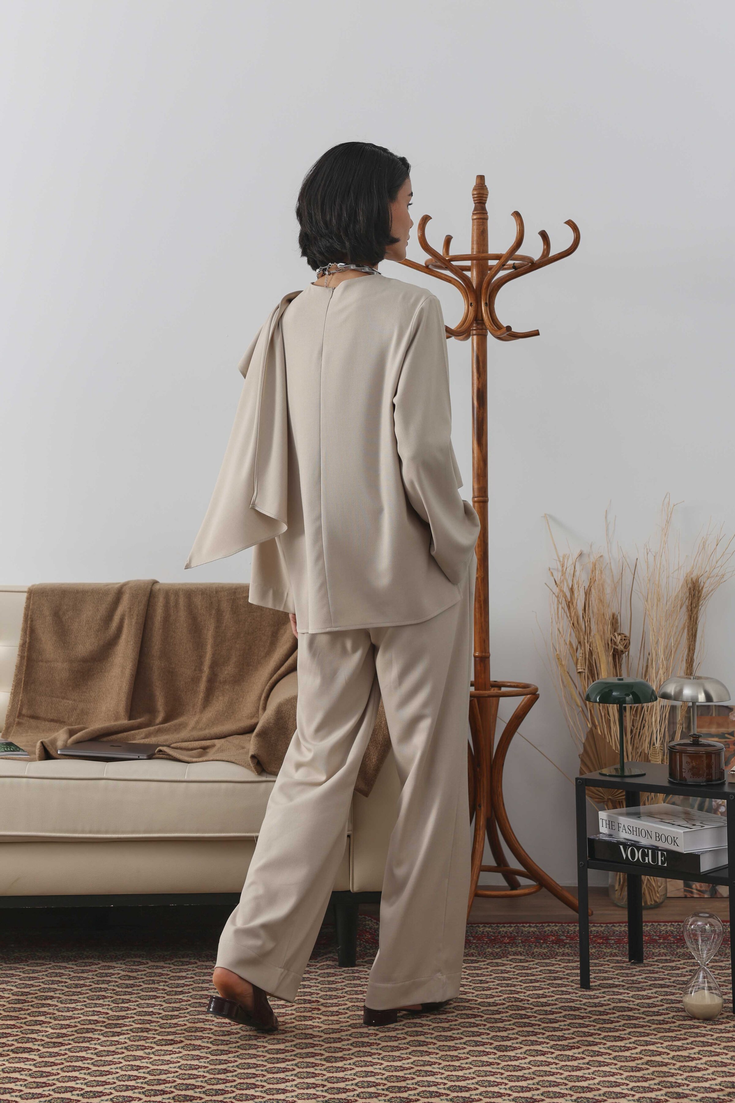Şal ve broş detayı görünümünü bir üst seviyeye çıkartırken zamansız bluz modeli zarafetiyle dolabının vazgeçilmezi olacak. Özel dokuma sonbahar kışa özel kumaşın dokusu dört mevsim seni rahat hissettirecek. Elevated Essence koleksiyonunun minimal ve zamansız çizgilerini taşıyan şal detaylı bluz uzun yıllar seninle!